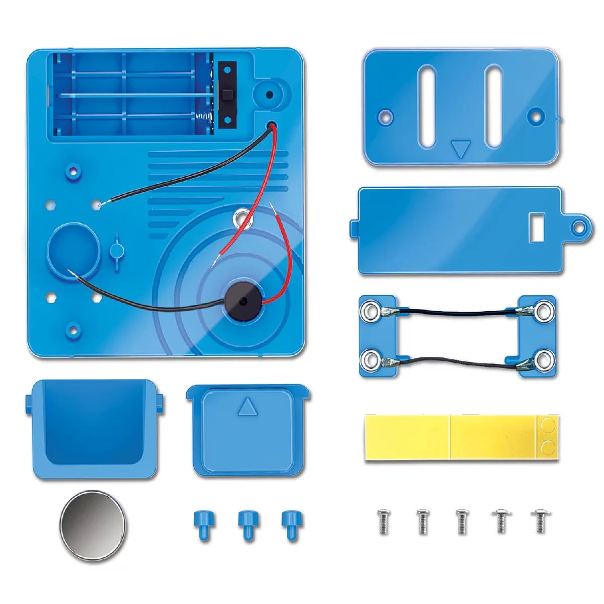 4M Magnetic Alarm Kit Meet the Magnetic Alarm Kit! Magnetic Alarm can keep all intruders away from your room! How? When the door or cabinet is opened, the alarm will start to warn you. You can attach the Magnetic Alarm to your door or to the cabinets. The choice is yours! Thanks to the Magnetic Alarm, children will discover the Science of Magnetic Field in a fun way and will learn how a magnetic switch works in an electric circuit. In the kit; Base, Cover, Magnet, Magnet holder, Eyelet plate set, Battery cover, Adhesive tape, Metal disc, 3 pieces Terminal cover, 3 pieces Screws, 2 pieces Screw washers are included. Additionally, 2 x 1.5 volt AAA batteries, a small Phillips screwdriver are required but are not included in the set. A detailed user manual is included in the kit. Please read it carefully. Box Dimensions: 23 x 19 x 7 cm. Age Group 5+ Years