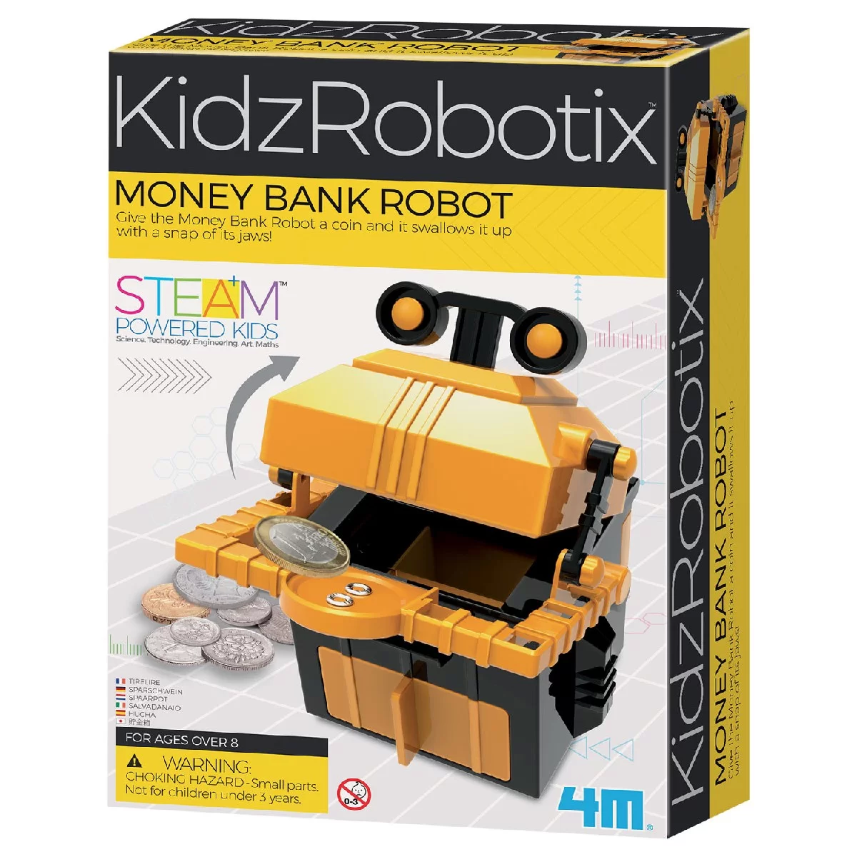 4M Piggy Bank Robot Kit The fun way to save coins with the Piggy Bank Robot! The jars used to save money hundreds of years ago started to be called "piggy banks". It is not easy to find a piggy bank from old times nowadays because the old piggy banks did not have holes at the bottom and they had to be broken to take out the money. Piggy Bank Robot swallows the coins you give it and keeps them inside. How? Place a coin on the robot's tray-like arm. The robot automatically swallows the coin! You can open the drawer to get your coin back. Children will love saving money thanks to this fun Piggy Bank Robot! Included in the kit; Rear body, Front body, Cover, Eye holder, 2 pieces of Connection, Coin lever, Coin drawer, Battery compartment cover, Motor compartment cover, Motor, 2 pieces of Wire, 2 pieces of Eye, 9 pieces of Terminal cover, 7 pieces of Screws. Also, a small Phillips screwdriver, a 1.5-volt AA battery is required, but is not included in this kit. There is a detailed user manual about the construction and use of the Robot Piggy Bank in the kit. Read carefully. Box Dimensions: 25 x 18 x 8 cm. Age Group: 8+ Years