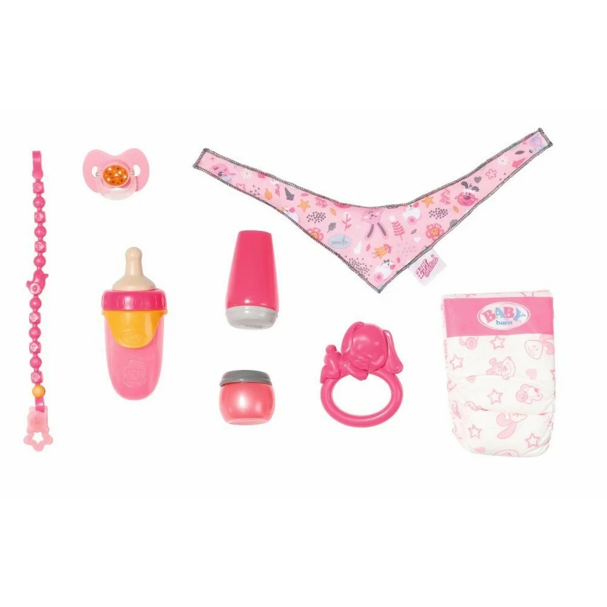 Kids will love the eight-piece Baby Born set, which includes all the accessories needed to start the Baby Born journey!