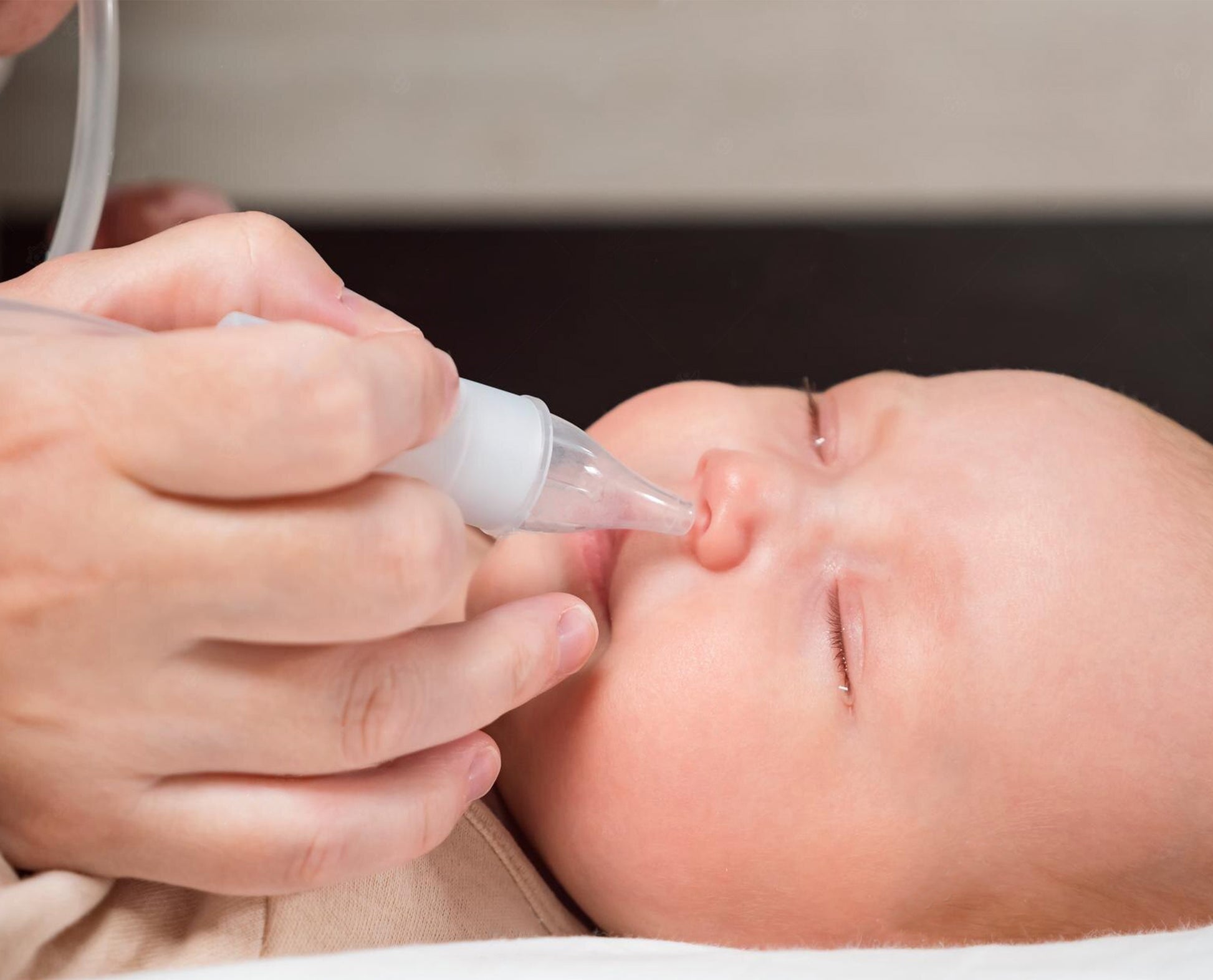 2. Hold the aspirator on your baby's nose with one hand and place the other side of the aspirator to your mouth with the other hand. Clean your baby's nose by breathing in gently with the vacuum method.