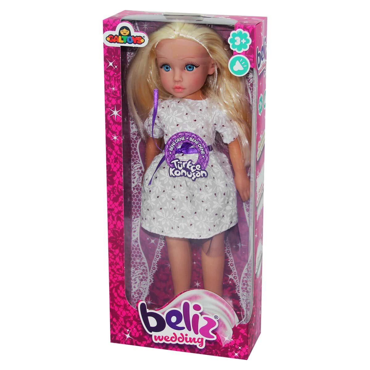 Beliz is Getting Married Turkish Speaking Baby Baby Beliz is very beautiful in white. Baby Beliz can speak Turkish. Press the button on the baby's belly to make the baby talk. Will you comb my hair? Let's go for a walk Let's go. Shall we have a coffee? Let's not dry my hair. Can you change my clothes? Age Group: 3+ Years Barcode: 8692644042205 Item No: GLT1209 Box Dimensions: 42 x 18.5 x 8.5 cm. Desi Value: 2