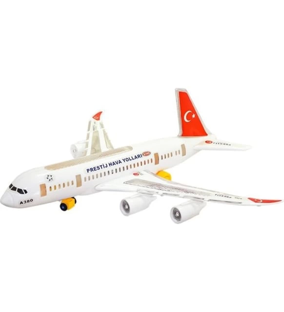 Airplane with Boxes, Lights and Music Welcome to Prestij Airlines! Traveling with the A380 Aircraft is very exciting! Children will have a great time with this passenger plane with lights and music. Airplane Size: 49 x 51 x 15 cm. The product works with 3 AA batteries, batteries are not included in the box. Box Dimensions: 48 x 11 x 13 cm. Age Group 3+ Years