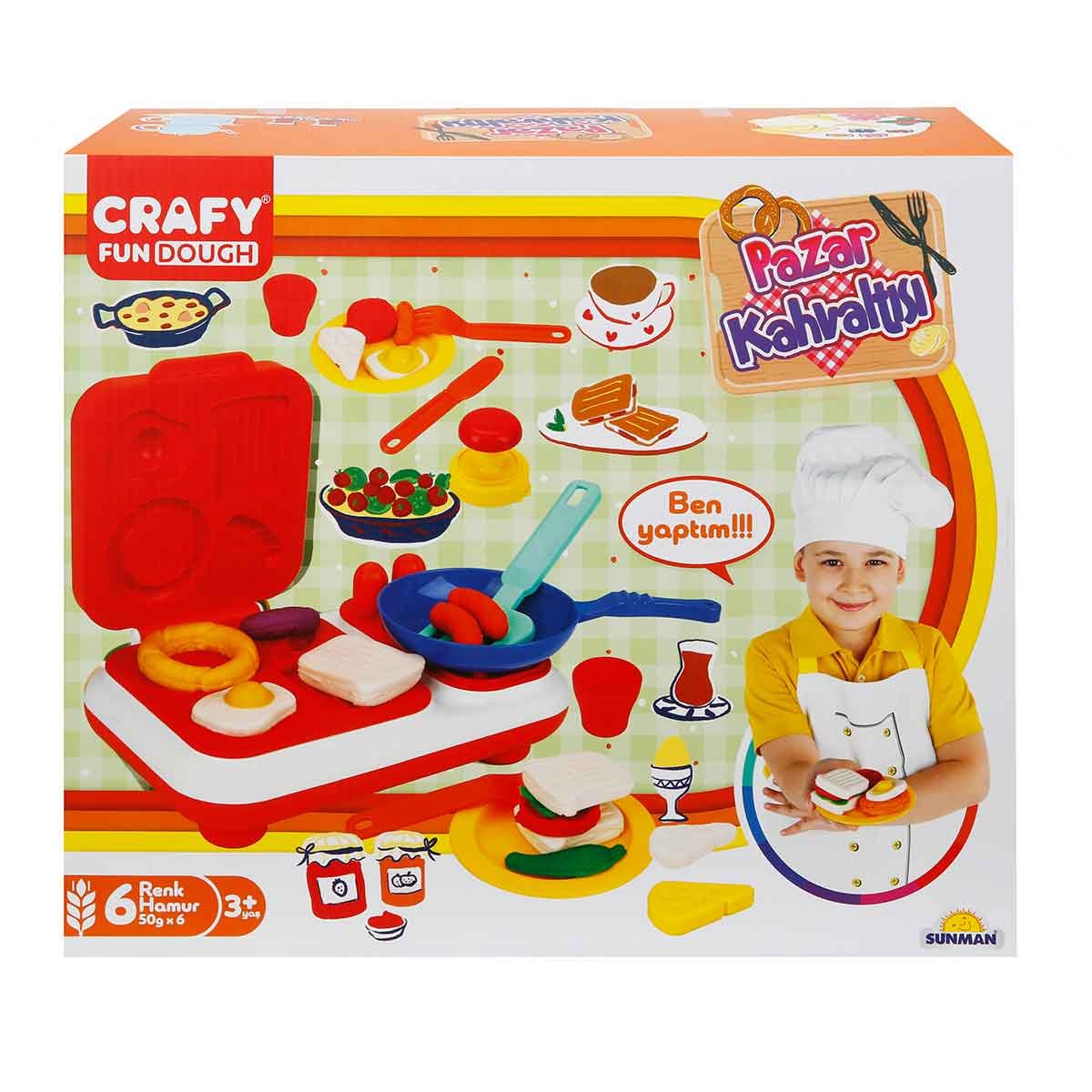 Crafy Sunday Breakfast Play Dough Set 23 Pieces Sunday Breakfast gets colorful with Crafy! You'll find everything you need to prepare a great breakfast in this set! Crispy bagels and breads, perfectly cooked eggs, fresh tomatoes, delicious fried sausage and menemen... It's all on the breakfast table! The tea is ready! Put the pan on the stove and turn the heat! The sounds coming from the stove knobs will make you feel like you're in the kitchen! You can prepare a breakfast inspired by the menu or make any food you want any way you want. Because there's talent in your dough! The 23-piece set includes 6 pieces of Crafy play dough (50 grams each), 1 breakfast mold with stove, 1 pan, 1 spatula, 2 glasses, 2 teaspoons, 2 plates, 2 forks, 2 knives, 1 cheese mold, 1 tomato-shaped press, 1 scalpel knife, and 1 menu. Accessory colors may vary. Play dough helps your child develop manual skills. Giving different shapes to colorful dough develops children's creativity and enriches their imagination. It is very useful for preschool play activities. The dough colors in the set are 6 colors: white, red, yellow, green, orange and purple. Thanks to the practical information on the box, children will learn by experimenting which colors can be created by mixing primary colors and other colors, and in this way, they will understand cause and effect. Crafy play dough is produced entirely from natural food ingredients, does not contain paraben, has passed allergen and dermatological tests. It does not contain anything harmful to children's health, it is completely safe. Age Group: 3+ Years Barcode: 8680863027929 Item No: S03002051 Box Dimensions: 35.5 x 12.5 x 29.5 cm. Desi Value: 5