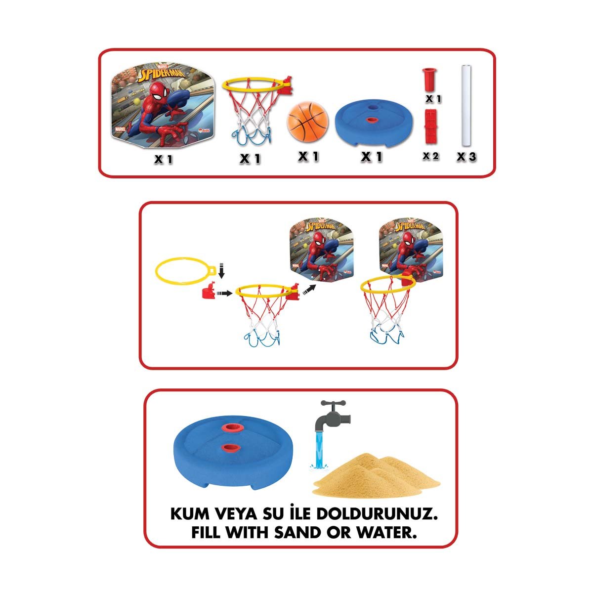 Dede Spiderman Small Pedestal Basketball Hoop It is a free-standing basketball hoop made for children who are interested in basketball and looking for a sporting activity. The height of the hoop can be adjusted in 2 sizes. Adjustable Length Dimensions: 93 x 126 cm The diameter of the hoop is 21 cm. Adult Water or sand must be filled into the reservoir to fix the hoop. Plastic basketball is included. Original Licensed Product. Age Group: 3+ Years Barcode: 8693830036534 Item No: 03653 Box Dimensions: 41 x 34.5 x 11.5 cm.