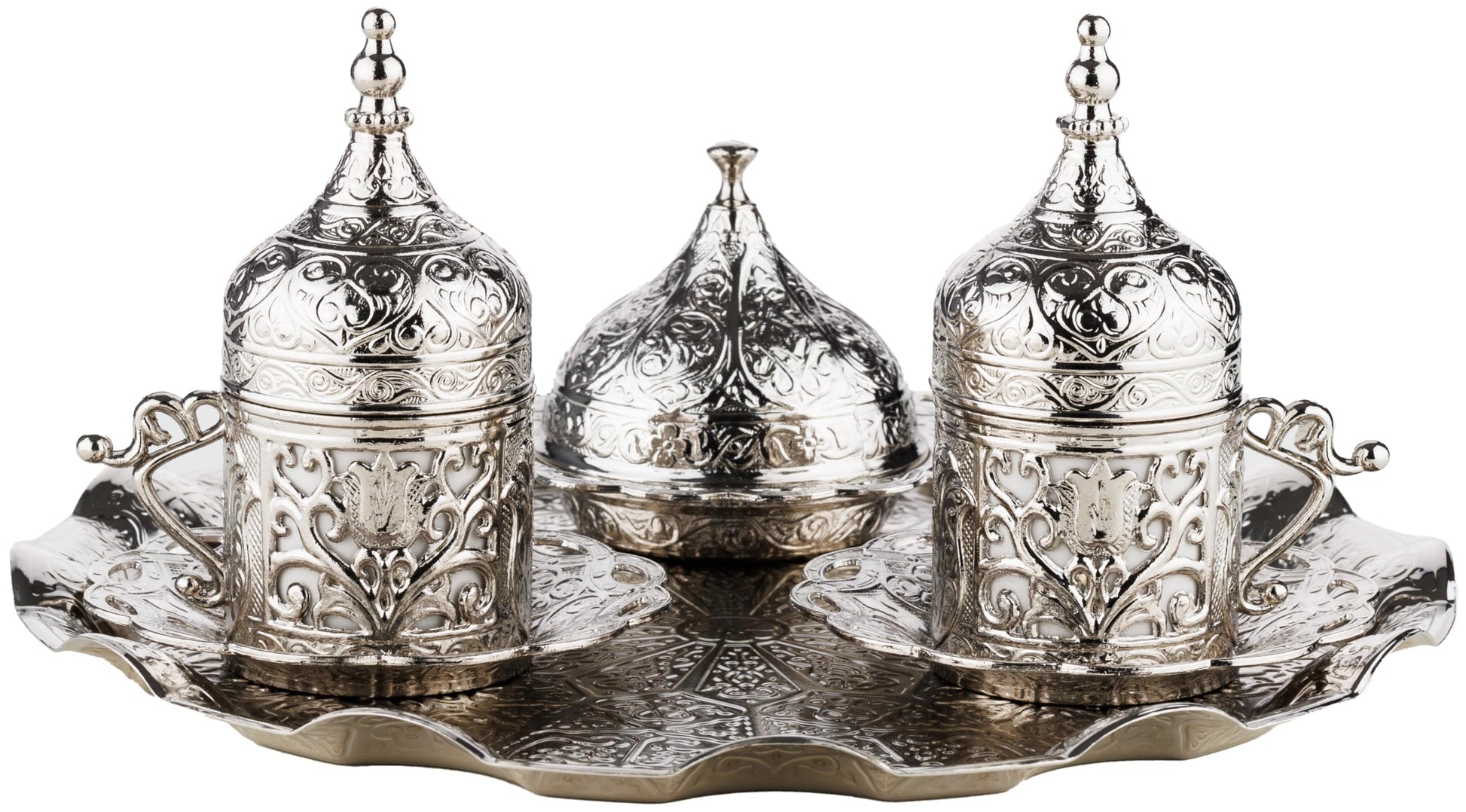 DEMMEX Turkish Greek Arabic Coffee Making and Serving Full Set with Cups, Saucers, Lids, Sugar Bowl, Tray and Antiqued Copper Coffee Pot, 12 Pcs (Silver)