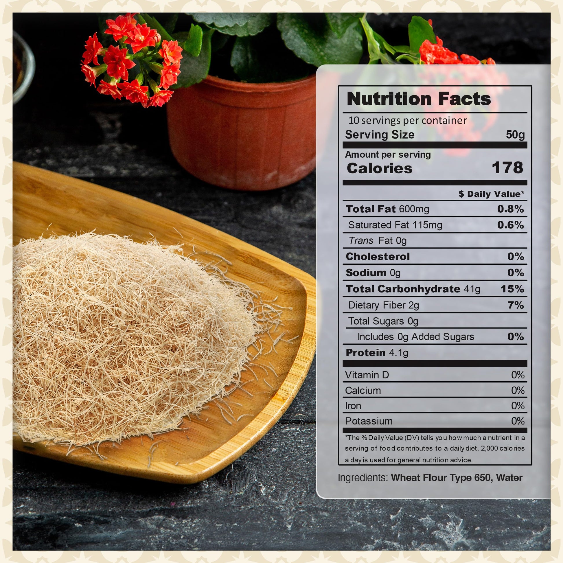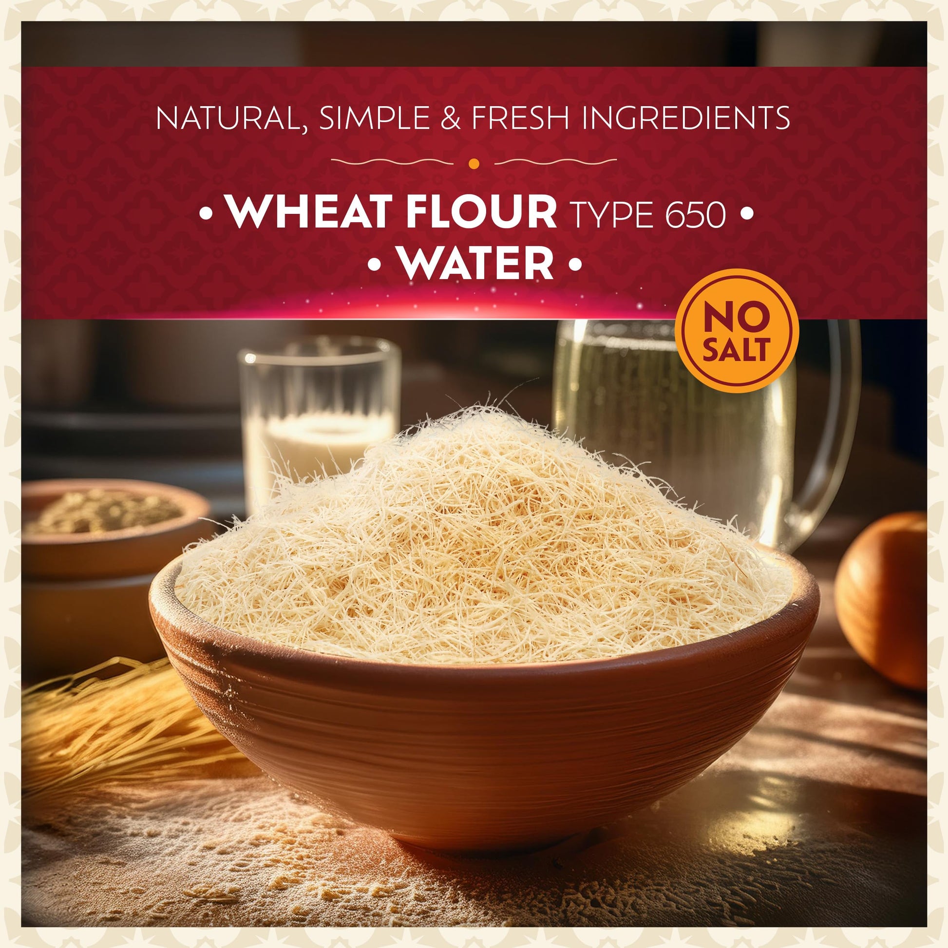 - MADE & METICULOUSLY PACKAGED IN TURKEY: No mess; the outer box is thoughtfully shrink-wrapped for your convenience. The kataifi in the cardboard box is also wrapped separately to ensure freshness and pristine condition. Halal product. INGREDIENTS: Wheat Flour selected from the finest farms and producers of the region, Water. Allergen Warning: Includes wheat gluten