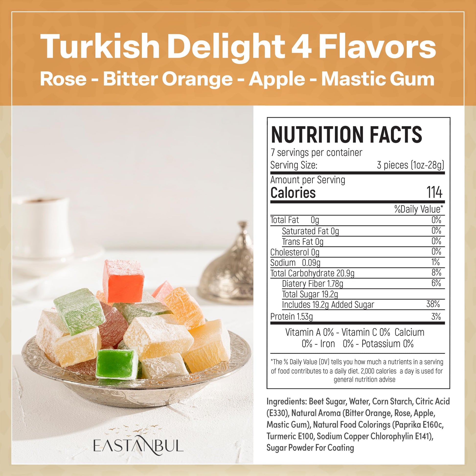Eastanbul Turkish Delight, 10.5oz, Turkish Delights Candy Assorted, Rose, Orange, Apple, Mastic Flavor, International Candy, Lokum, Plain, Gluten Free, No Synthetic Ingredient, Vegan