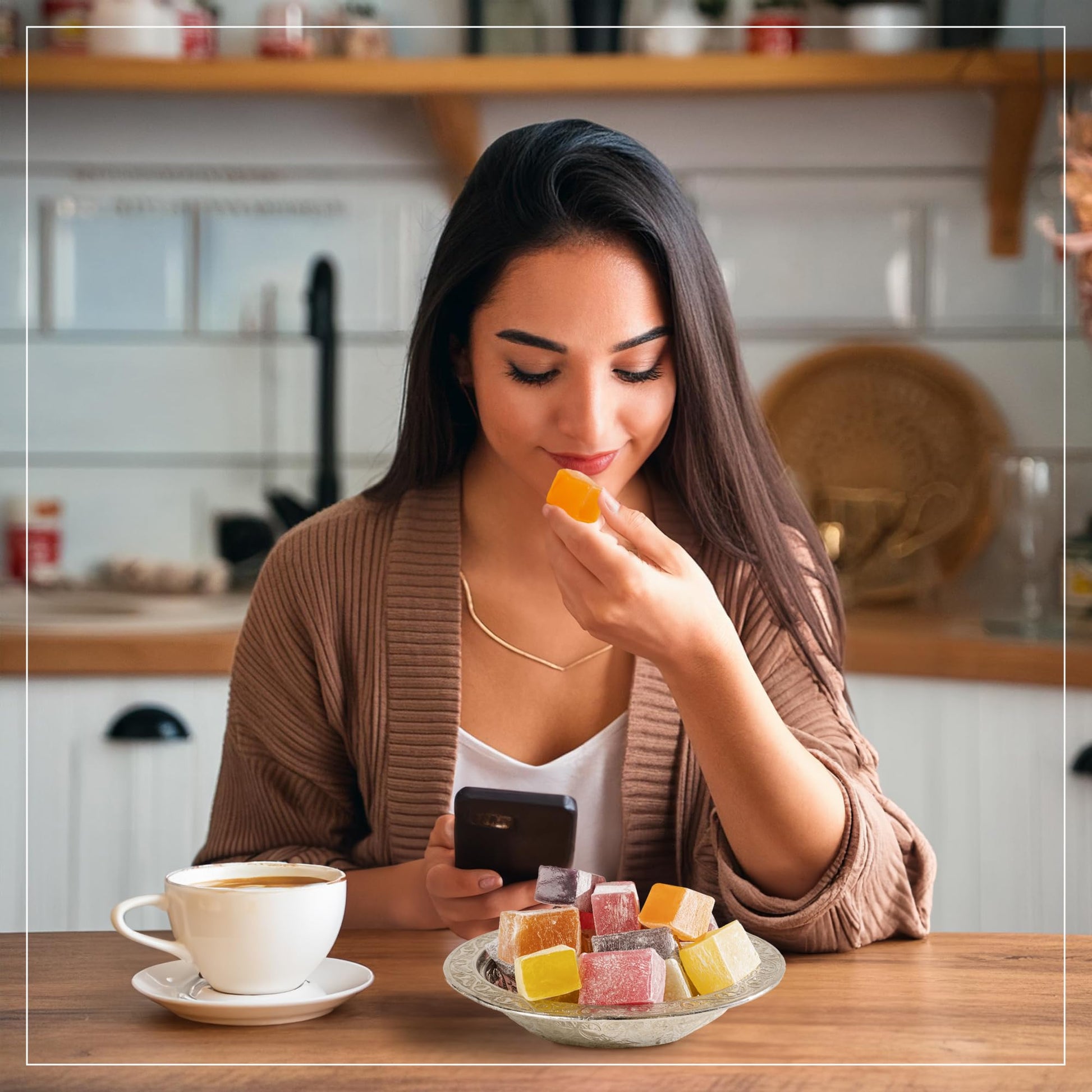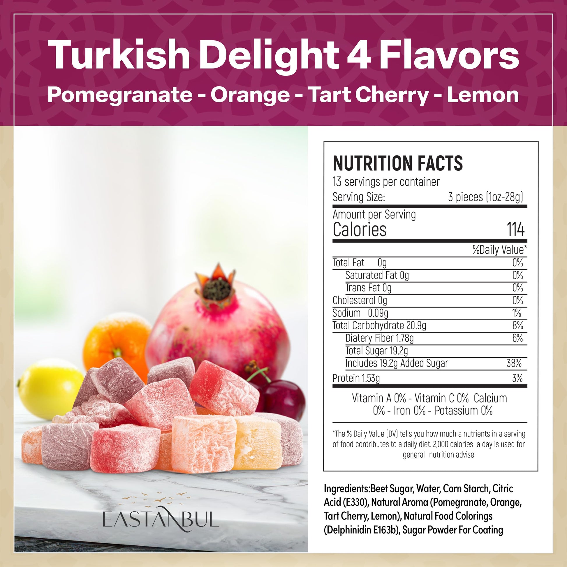 - DECADENT ASMR CANDY: Traditional Turkish Delights Candy with Pomegranate, Orange, Tart Cherry, & Lemon flavors. The Turkish Delight leaves a soft, juicy, chewy, and pleasant lingering taste on your tongue and bears a jewel-like appetizing bright color. No cloyingly overpowering throat-burning aftertaste. Amazing consistency