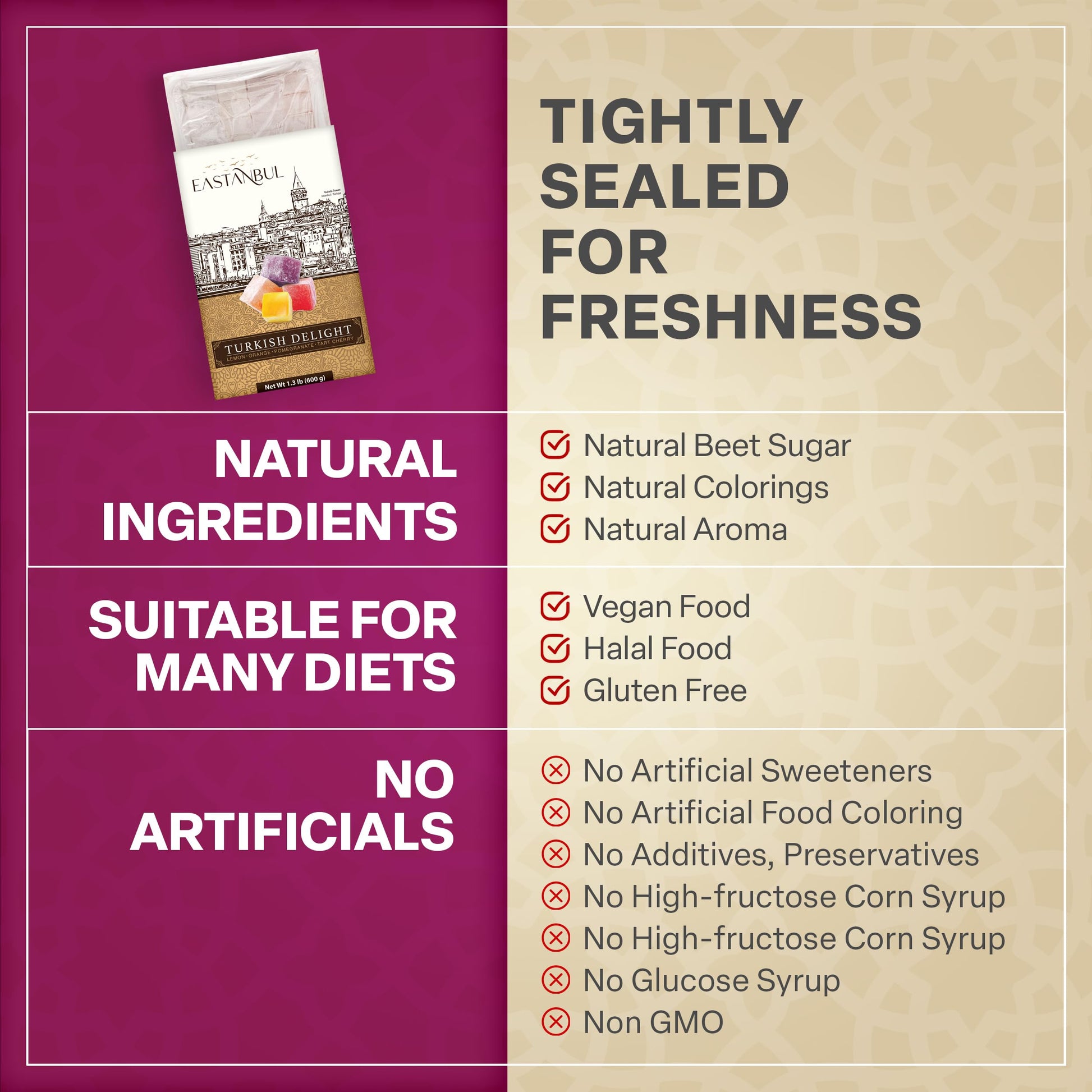 - AUTHENTIC TURKISH SNACKS W/CLEAN INGREDIENTS: No artificial flavoring, no additives or preservatives, no glucose, no corn syrup, and No "Nature Identical" Flavors. Only Natural Flavors derived from real fruits and flowers. Sweetened with the best quality beet sugar from the finest local providers in Turkey and coated with just the right amount of confectioner's powdered sugar to ensure freshness and flavor integrity