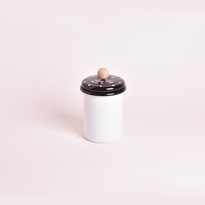 Enamel Jar No. 1 White Black Dimensions: Diameter: 8.5 cm Height: 11 cm Volume: 500 ml Material: Steel / Enamel Coating Color: White Lid Black Polka Dots