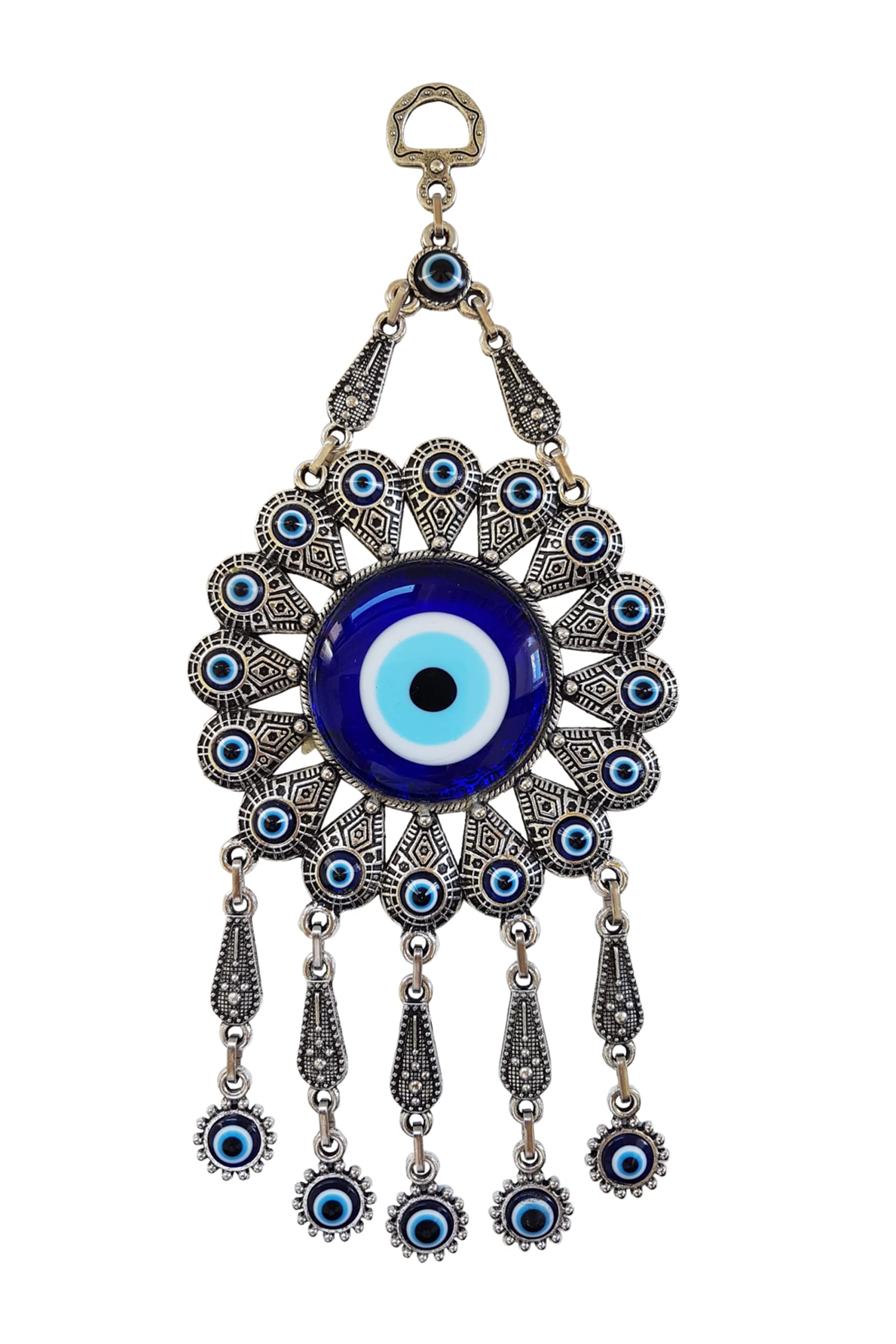 Erbulus Turkish Glass Blue Evil Eye Wall Hanging Ornament with Flower Design - Metal Home Decor - Turkish Nazar Bead Amulet - Protection and Good Luck Charm Gift in a Box