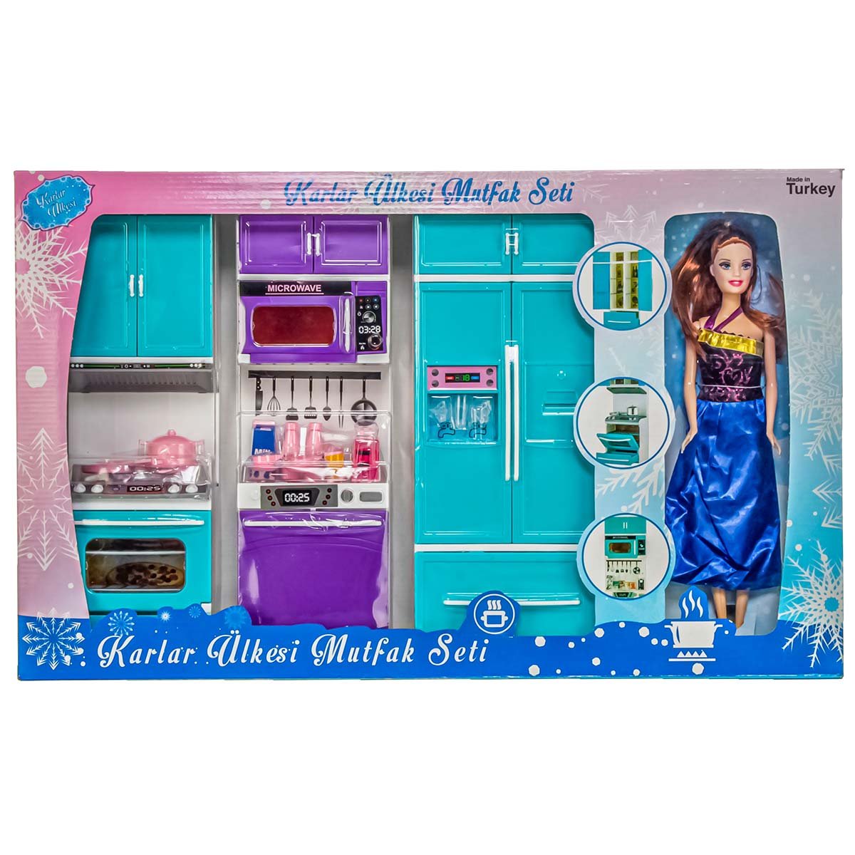Snow Country Baby and the 3-piece Kitchen Set With this toy set, children will have fun and develop their imagination. Children now have their own kitchen sets like their mothers. You will make your most delicious meals in this kitchen. The baby is approximately 29 cm tall. Products may show color differences periodically. Age Group: 3+ Years Barcode: 8893330023359 Item No: OYD-02335 Box Dimensions: 56.5 x 35 x 8.5 cm. Deci Value: 6