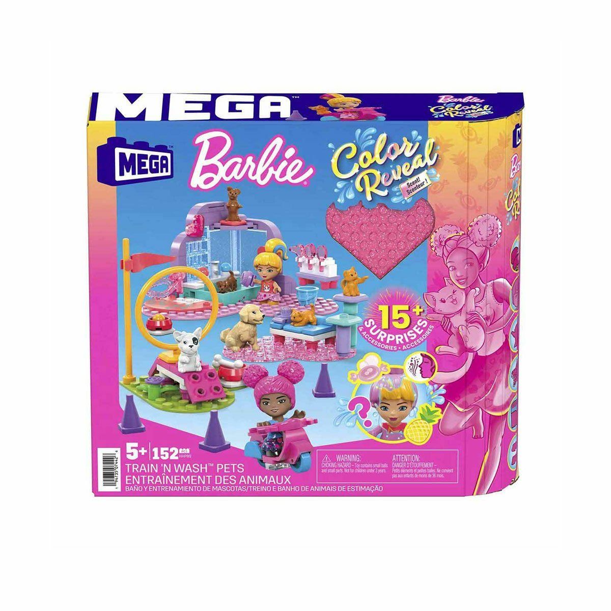 MEGA Barbie Color Reveal building toys offer an unboxing experience full of surprises. Each mini-doll's appearance is a magical mystery waiting to be discovered. Discover over 15 surprises, including scents. Build the learning center to teach your animal friends new tricks. Then, build the pet salon and playroom for fun with your furry friends.