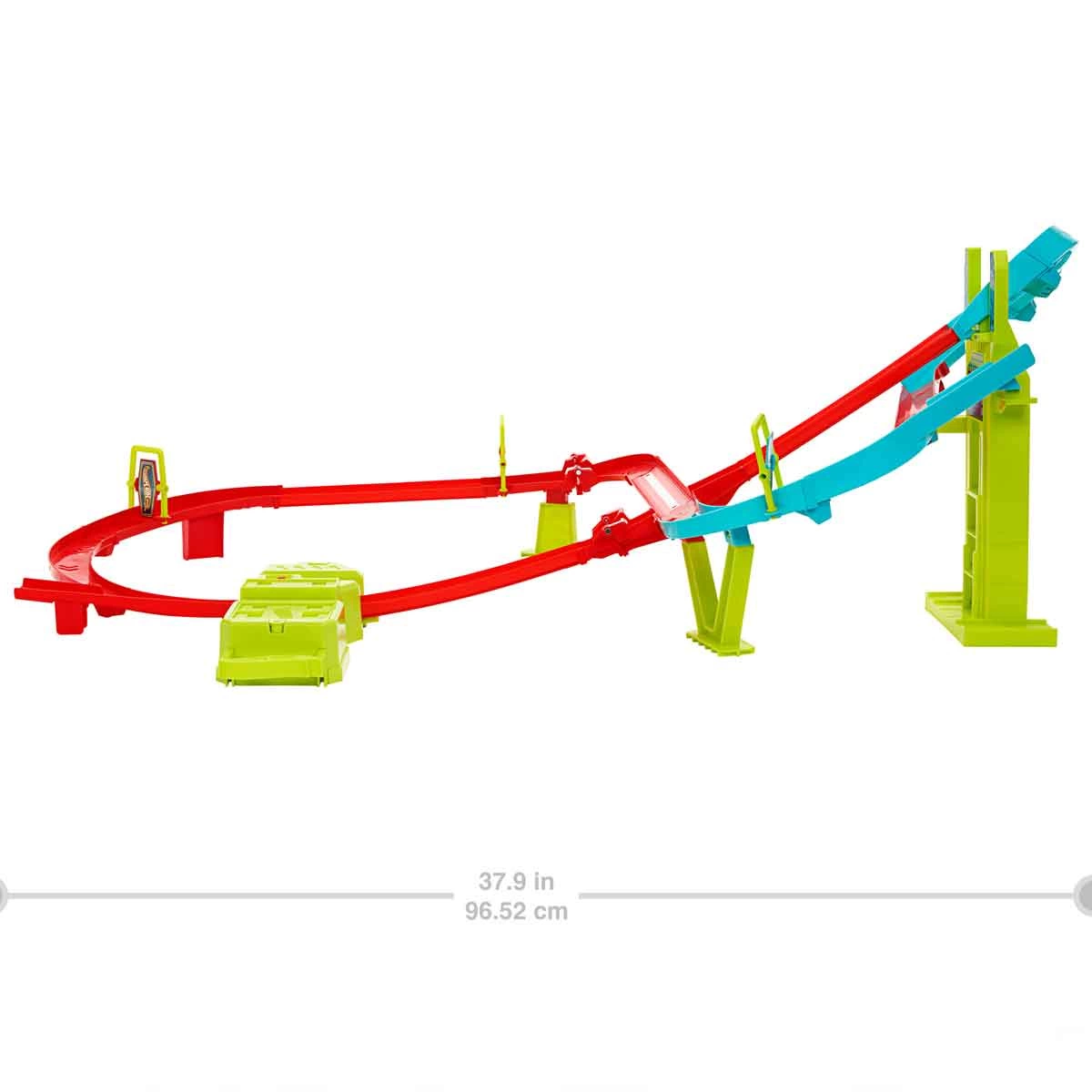 Hot Wheels Neon Speeders Multi-Race Thrill Track Set HPC07 Race through an awesome cityscape with the Hot Wheels Neon Speeders Skyscraper Speed Track Set. Kids load their Hot Wheels cars into a motorized booster that launches the cars along a track and around a skyscraper. As the cars accelerate between the track fins, the lights create a seemingly pulsating effect. Motorized booster gets the cars racing, add more cars to increase the excitement and the potential for an epic crash. One Hot Wheels car is included, and the set folds for convenient storage. Colors and decorations may vary. Race around the neon-themed track of the Hot Wheels Neon Speeders Skyscraper Speedway Set. Place the included Hot Wheels car into the set's motorized booster, which propels it up and around a skyscraper on a three-colorful track. The set folds for easy and convenient storage. Add more cars to ramp up the excitement and heighten the anticipation of an inevitable crash. (Includes one Hot Wheels car. Additional cars sold separately.) As the vehicles accelerate between the track fins, they create a light effect that makes the lights look like they're flashing. Hide the additional 1:64 scale cars in designated spots inside the skyscraper and on the motorized elevator. Age Group: 5+ Barcode: 194735155149 Item No : MATE-HPC07 Box Dimensions : 41.5 x 34 x 10 cm. Desi Value: 5