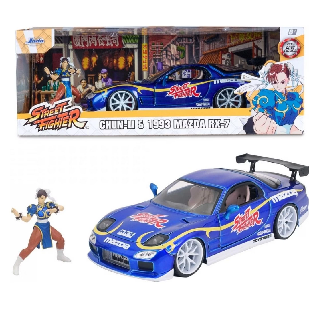 Jada1/24 Street Fighter 1993 Mazda RX7 Jada Toys Street Fighter figure Chun-Li and model car 1993 Mazda RX-7 are a perfect gift choice for kids and fans! Figure Size: 6 cm. Car Size: 20 cm. The toy car is designed with the characteristic colors and patterns of the famous Qipao dress of the video game character Chun Li Age Group 8+