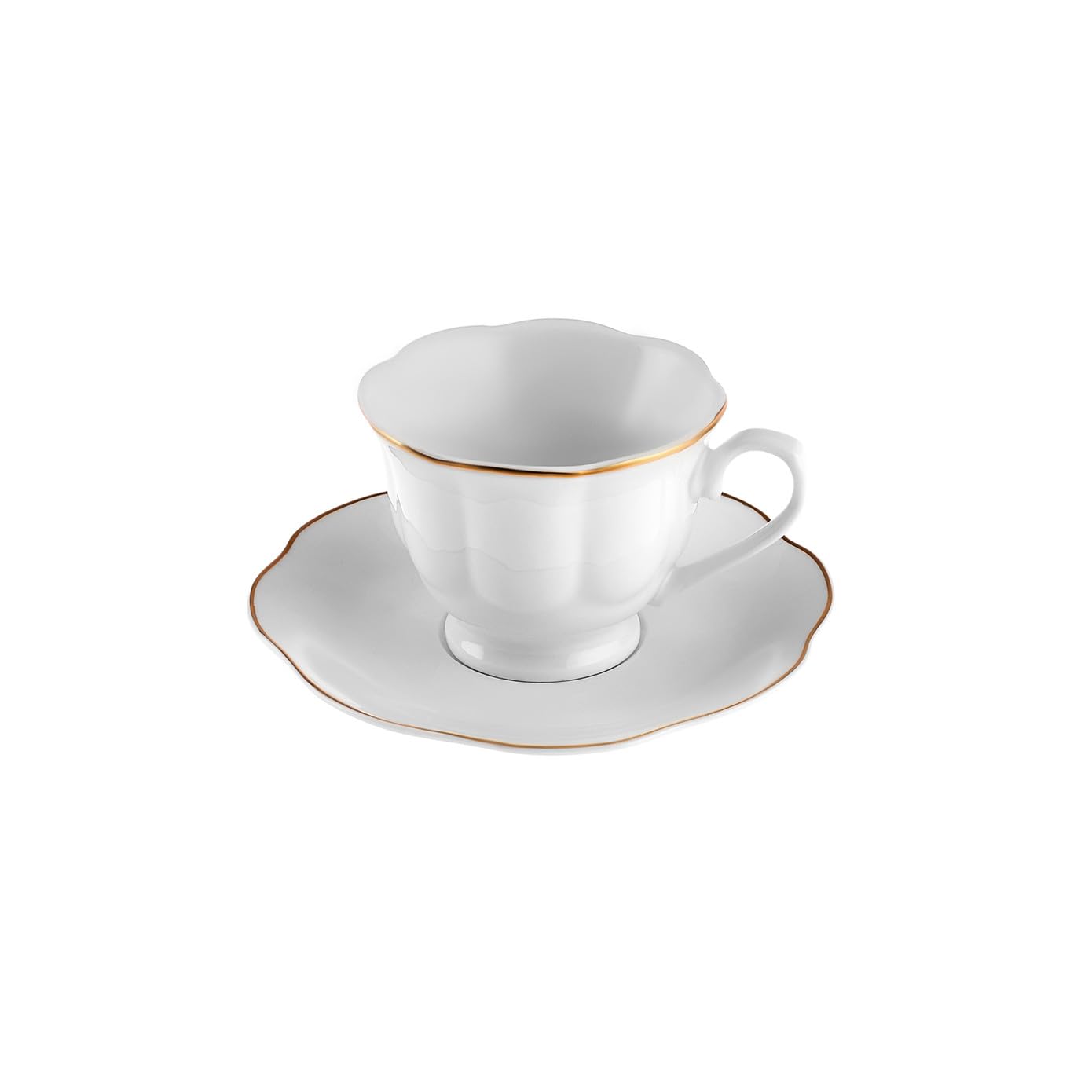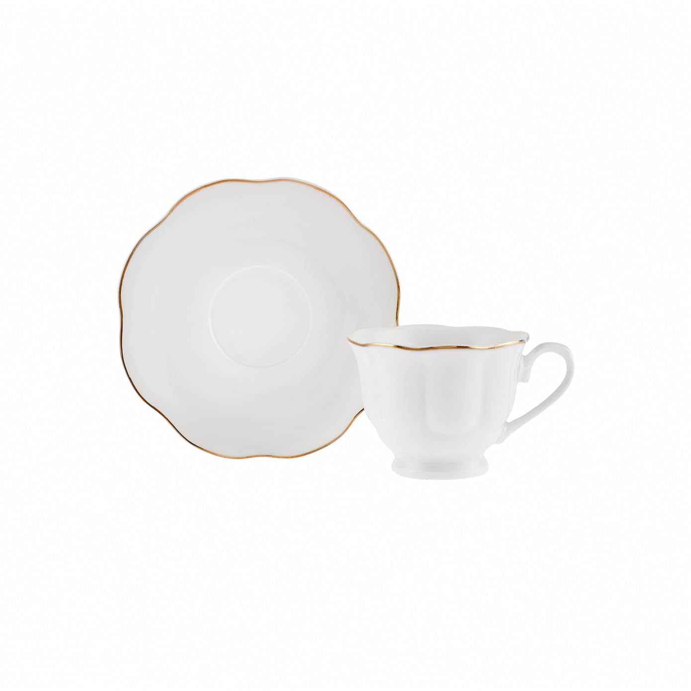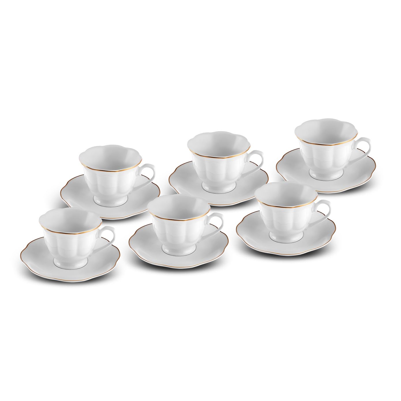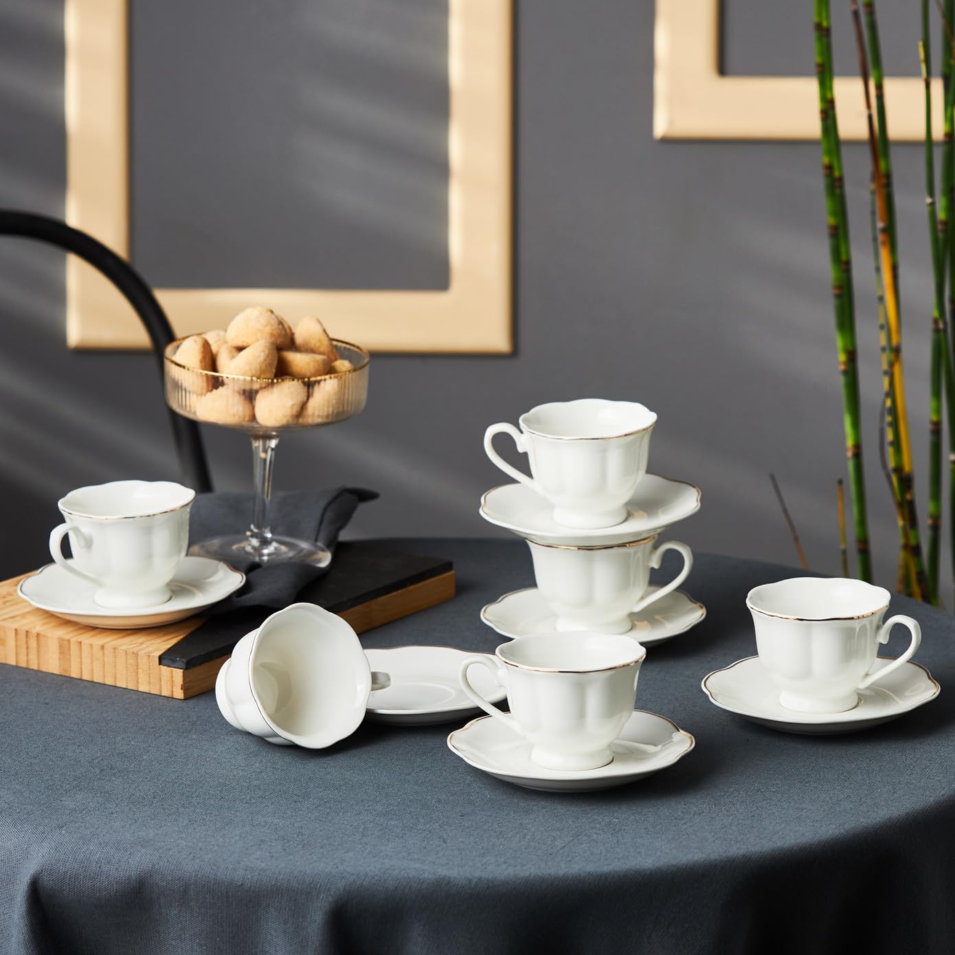 - 12-Piece Coffee Cup Set: This small coffee set has 6 porcelain cups paired with matching saucers. Sipping your morning coffee from a cup adorned with a delicate white and gold pattern.