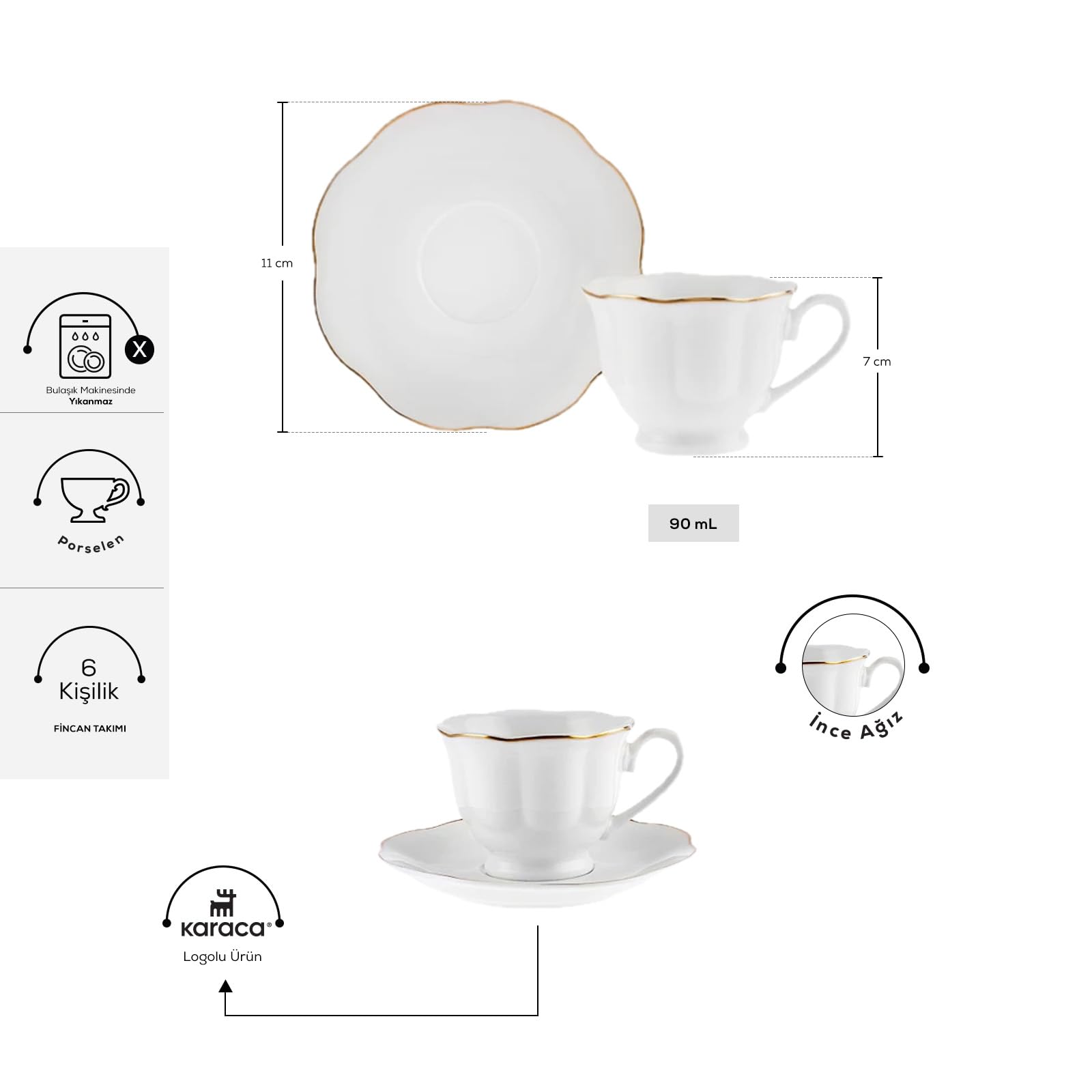 Details: Indulge in the exquisite charm of the Karaca Porcelain Espresso Turkish Coffee Cup Set, an embodiment of elegance and sophistication. Elevate your coffee ritual with this enchanting collection, which includes a set of 6 delicate 90ml espresso cups, each adorned with a captivating blend of white and gold, showcasing Karaca's timeless craftsmanship. Savor the authentic essence of Turkish coffee as you sip from these dainty yet functional cups, specially designed to enhance your coffee experience. The set also includes matching saucers, creating a harmonious ensemble that adds a touch of luxury to your moments of respite. Crafted with precision and passion, this 12-piece collection invites you to explore the world of rich aromas and bold flavors. Whether you're a connoisseur of espresso or a devotee of small coffee cups, this Karaca set effortlessly combines style and substance, making it an ideal addition to your coffee cup repertoire. Elevate your mornings, indulge in after-dinner conversations, or host an intimate gathering with friends, all while relishing the magic of Turkish coffee in these Karaca Espresso Cups. Let your coffee moments transcend into a realm of refinement and taste, making every sip a delightful journey of sensory pleasure.