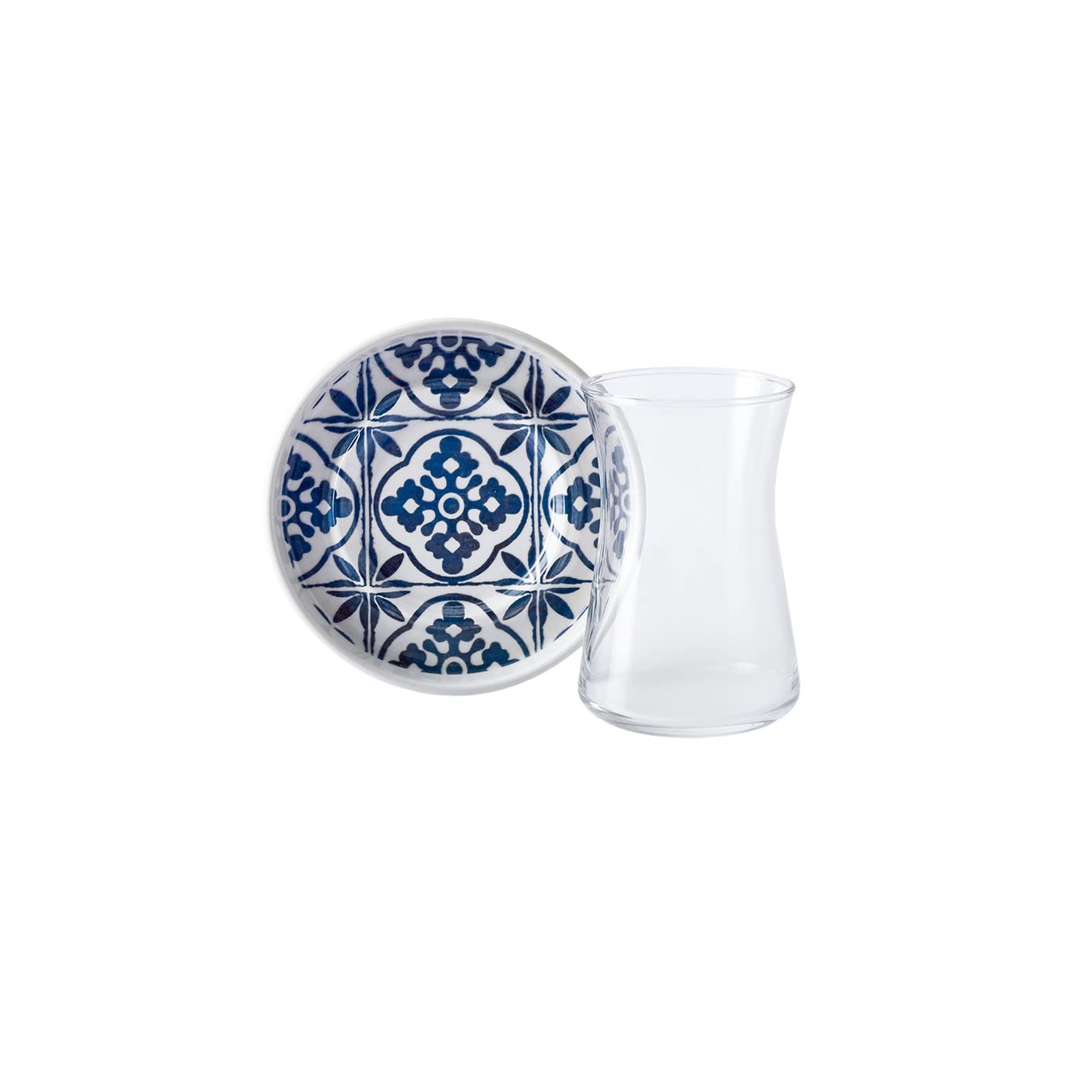 KARACA Mavili Turkish Tea Cups Set - 12 Piece Turkish Tea Glasses and Stoneware Saucers - Authentic Glass Drinking Sets for 6 People - Ideal Adult Teacup Set (170 ml)