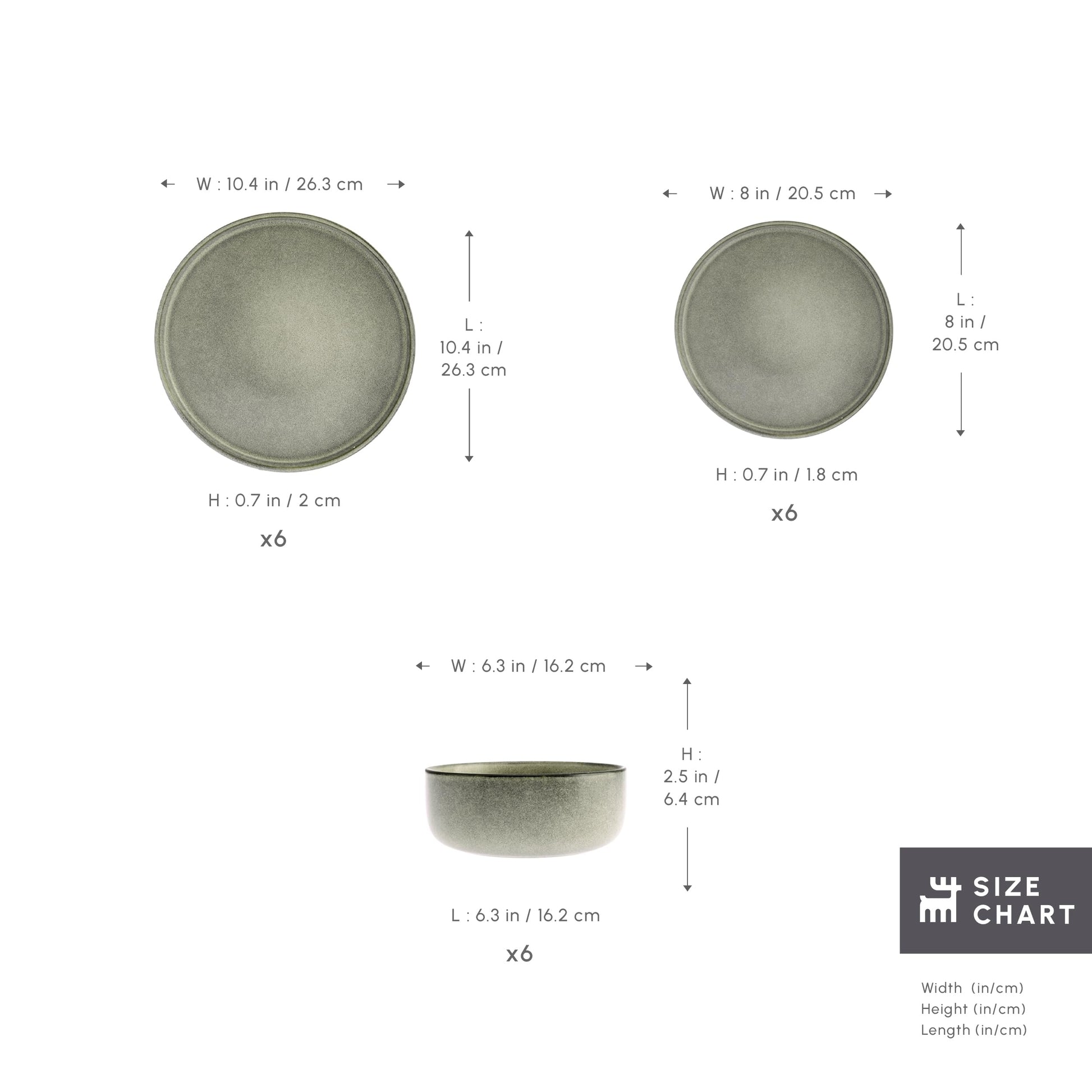 - Complete Set for 6: Immerse yourself in the most lavish dining experience possible with this set containing 6 dinner plates (26.3cm / 10.35"), 6 dessert/side plates (20.5cm / 8.07"), and 6 cereal/soup bowls (16.2cm / 6.38"). Designed to be used by 6 diners, this dishes set is ideal for family gatherings and special occasions.