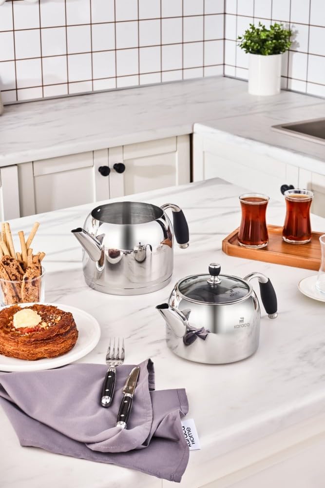 Details: Karaca Stella Stainless Steel Teapot Set offers both style and functionality for tea lovers. Made with 18/10 stainless steel, this stainless steel tea pot is durable and resistant to rust, ensuring longevity. It includes a 1L teapot and a 2L water tank, providing ample capacity for brewing and serving tea. The non-flammable handles are designed for easy, safe pouring, even when the teapot is hot. This teapot set is induction-compatible, offering quick and efficient heat distribution on all stove types. Its elegant silver finish adds a sophisticated touch to your kitchen, while the specially polished surface ensures it retains its shine for years. Cleaning is effortless, thanks to its smooth surface, making it a practical choice for everyday use.