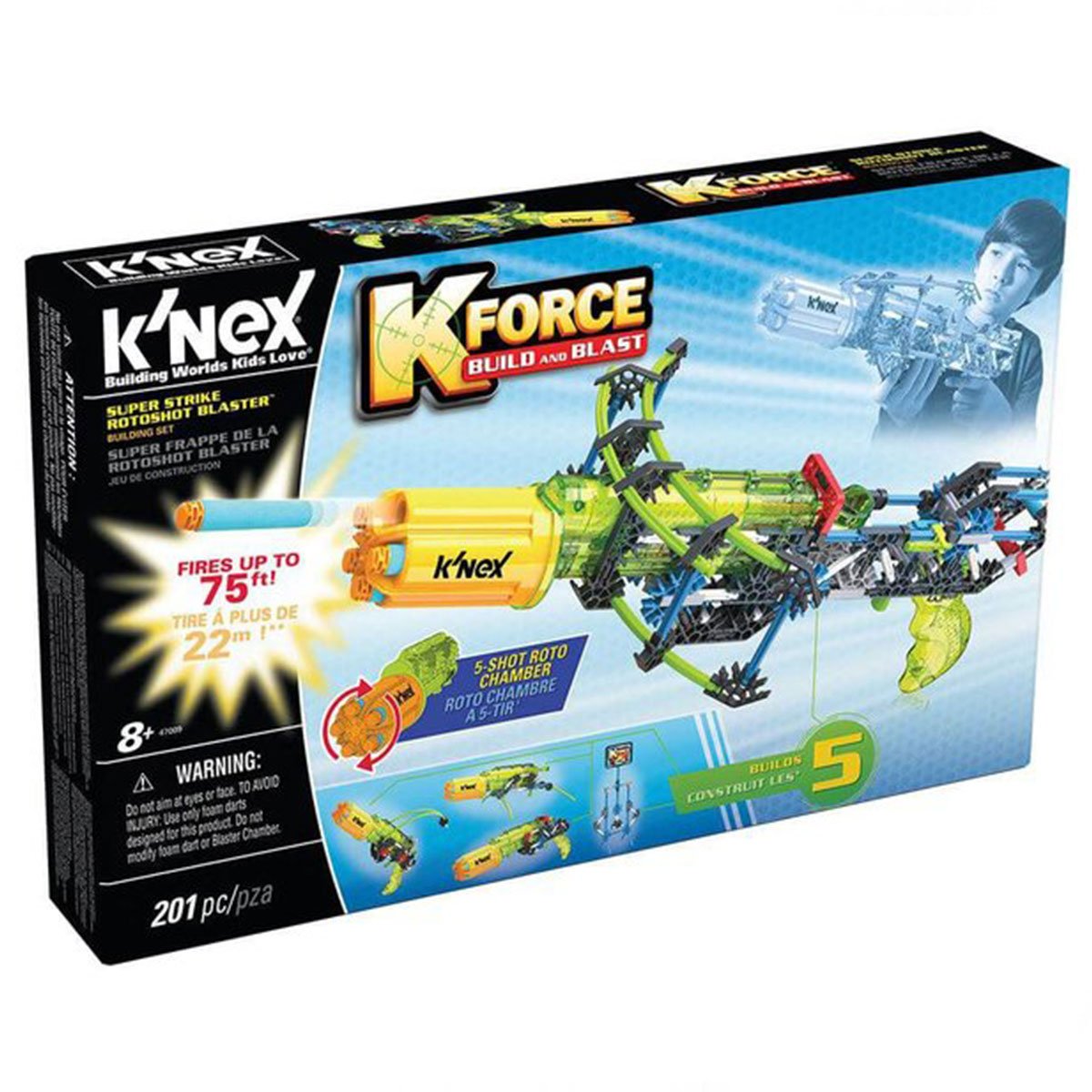 K'Nex K-Force Super Strike Rotoshot Blaster Building Set 47009 We're building an amazing Blaster with KNEX! You'll love the KNex K-Force Super Strike Rotoshot Blaster Building Set very, very much. Combine the perfectly designed rods with the help of connectors to create the body of the Blaster! The K-Force Super Strike Rotoshot Blaster, which allows you to continue the game without interruption by taking 5 darts, It contains 1 RotoChamber, 5 foam darts, 1 handle and a holding ring. Blaster can throw darts up to 22 meters. Each color group has different dimensions so that you can place the pieces appropriately. (Green pieces are 1 cm, white pieces are 2 cm, blue pieces are 3 cm, etc.) The weight of the product is 839 gr. Many fun and different design models can be downloaded from the website. 201 5 different toys can be built using the parts in the play set. (Each model can be built at once.) Age Group: 8+ Years Barcode: 744476470096 Item No: KNX/47009 Box Dimensions: 42 x 26.5 x 6.5 cm. Desi Value: 3