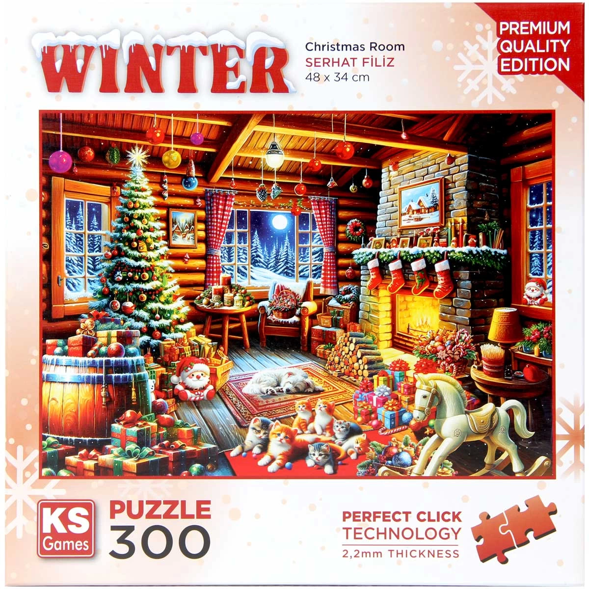 KS Games Christmas Room Puzzle 300 Pieces Carefully selected images that appeal to every taste, textured paper processed with the highest print quality, 2.2 mm piece thickness, special puzzle cardboard and above all, "Perfect Click" technology that ensures the pieces fit together perfectly... All of these constitute the indispensable elements of the unique puzzle experience that KS Games's exclusive collection offers to users who care about details. In addition, KS Games never compromises on its high environmental awareness and low carbon footprint principles with the recyclable materials and environmentally friendly components it uses in all its products. Number of Pieces: 300 pieces Finished Puzzle Size: 34 x 48 cm. Box Dimensions: 26 x 26 x 6.5 cm. Age Group 3+