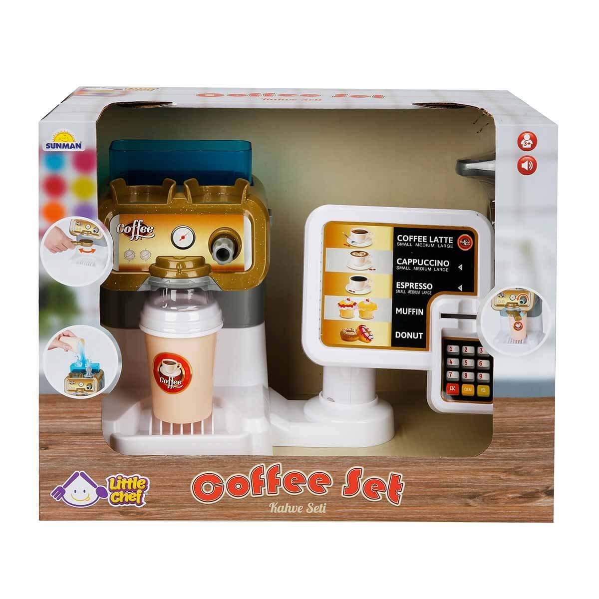 Little Chef Sound Coffee Machine and Case Set With the Little Chef Sound Coffee Machine and Case Set, little baristas will have a very real coffee machine experience! When you fill the water tank with water, the water flows into the coffee glass. Your barista games are now more realistic with the tamper included in the set to compress the coffee and the realistic sound effects of the machine. Please do not fill the water tank with any liquid other than water. You can also easily pay by credit card and enjoy the pleasure of coffee. The set includes a coffee machine with cash register, a credit card, a coffee glass and lid, a tamper for compressing coffee, 2 sugars, 1 plate and 2 spoons. Children; It helps children experience the details of life themselves by developing their hand-eye coordination, imagination and hands-on experience. It works with 2x 1.5V AA batteries. Batteries are included in the box. Age Group: 3+ Years Barcode: 8680863025758 Item No: S00002575 Box Dimensions: 32 x 25 x 19.5 cm. Desi Value: 6