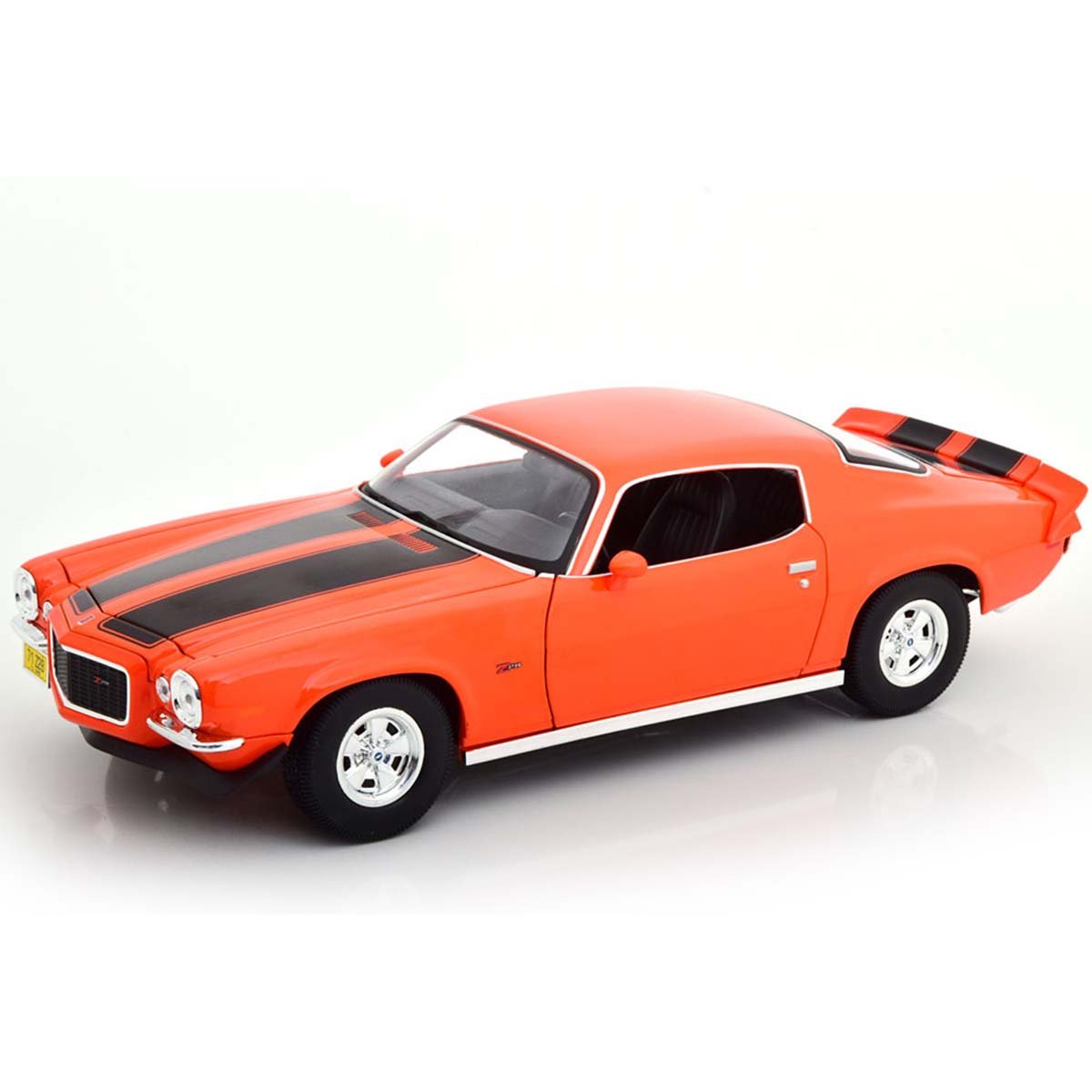 The 1:18 scale Maisto 1971 Chevrolet Camaro is made of metal. It features opening doors, opening front and rear hoods, steering wheel, and wheels that can turn left and right.
