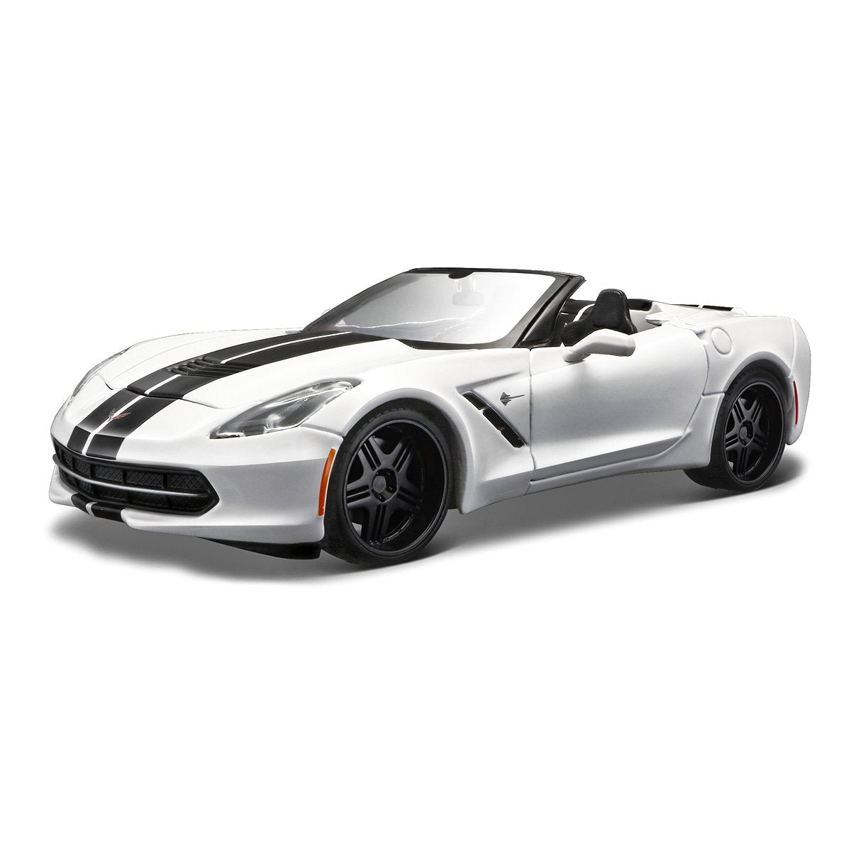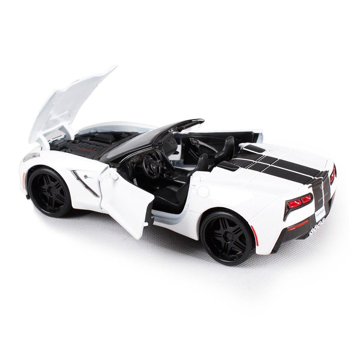 The 1:24 scale Maisto 2014 Corvette Stingray Model Car is made of metal. It features opening doors and a hood.