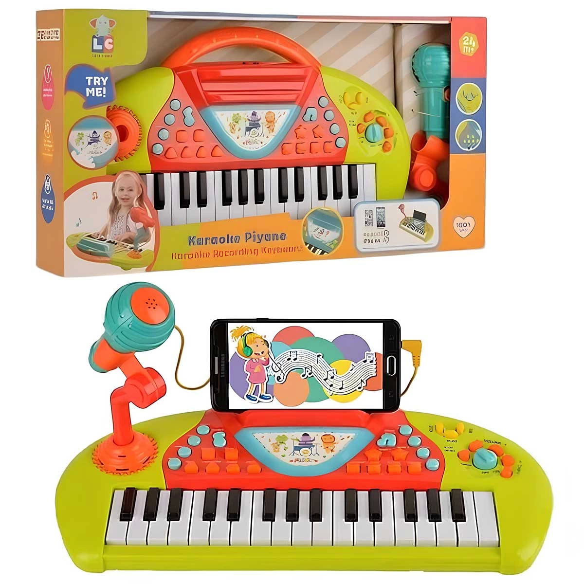 Multifunctional Piano with Karaoke Feature, Music, Lights, MP3 Input and Microphone Karaoke Piano is an electronic piano with fun features such as flashing lights, 8 musical instrument sounds, 8 musical styles, 3 drum sounds and 19 demo melodies. It has demo, tempo and sound recording, play and stop functions. Let's Be Child Karaoke Piano is the perfect toy that little ones can play with fun and safety. Produced in a durable and durable construction, this toy is made safe for children and the new world they discover. Since it is easy to clean, it is suitable for playing both indoors and outdoors. Designed to be suitable for small hands. It helps develop little ones' senses and fine motor skills. It helps to develop little ones' imaginations. and develops their creativity. Supports hand-eye coordination. You will love playing with your little ones, teaching them new things and having fun with them. The fun moments you spend with your children will contribute to their sensory development, thus supporting your children's learning through fun and games. Piano: 38x20 cm Microphone: 5x10 cm Box Dimensions: 42 x 25 x 7 cm. Age Group 6+ Months