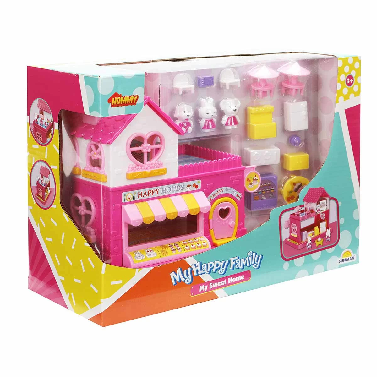 My Happy Family Mini House Play Set Girls will be able to play fun games with the Mini House Play Set! Place tables with umbrellas on the upper floor of your 2-storey sweet shop and your kitchen on the lower floor Display your sweet stands and start the game! Moreover, make the game more realistic with cute mini animal figures. Girls will love playing games with this cute house with a pink door and heart-shaped window! Included in the set; sweet shop, 3 mini animal figures, table, kitchen cabinets, chairs, refrigerator, etc. There are various accessories. The accessory colors of the product to be sent may vary depending on stock status. Product dimensions: 16.5 x 15 cm. Age Group: 3+ Years Barcode: 2014010132567 Item No: S00013256 Box Dimensions: 29.5 x 13 x 21 cm. Desi Value: 3