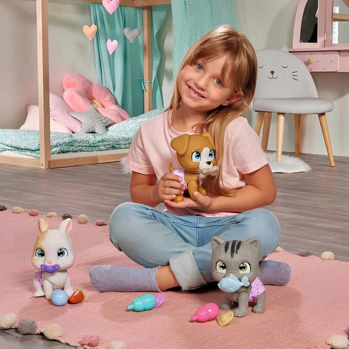Pamper Petz Dog 15 cm Now the Pamper Petz dog from Simba! With the drinking and wetting function, the sweet puppy with big, sparkling eyes can actually drink water. Then it goes directly into the diaper. If the diaper gets wet, the inside turns yellow. The magic claw shows if your pet is a boy or a girl. If you wipe it with water it turns either blue or pink and thus gives information about the gender. In addition to the puppy, the set includes three surprises for the care and feeding of the puppy, as well as an adoption certificate. Product dimensions: 15 cm. Box dimensions: 12 x 18 x 22 cm. Age Group 3+ Years