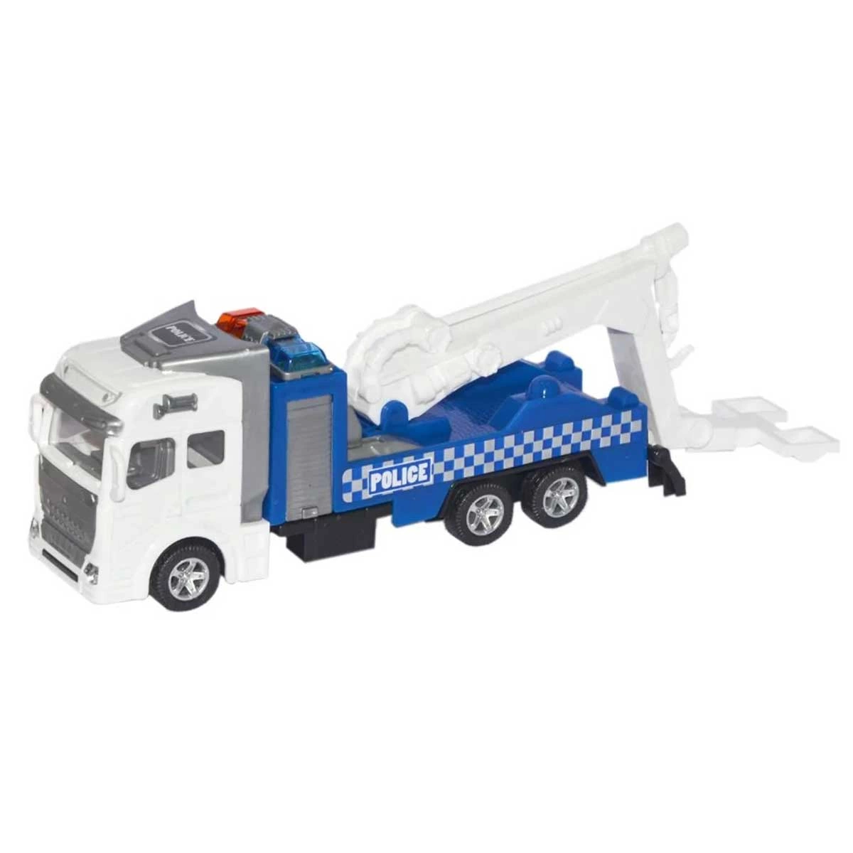 Pull&drop Police Tow Truck 21 cm Pull&drop Police Tow Truck has a pull-and-drop feature. The tow arm of the truck is movable and the side covers on the bed can be opened. IMPORTANT NOTE: The price is for a single product. The box image is shown like this because it is a 6-piece box. /> Age Group: 3+ Years Barcode: 8683813840029 Item No: 40029 Box Dimensions: 23 x 10 x 7 cm. Deci Value: 1