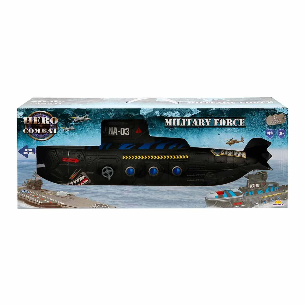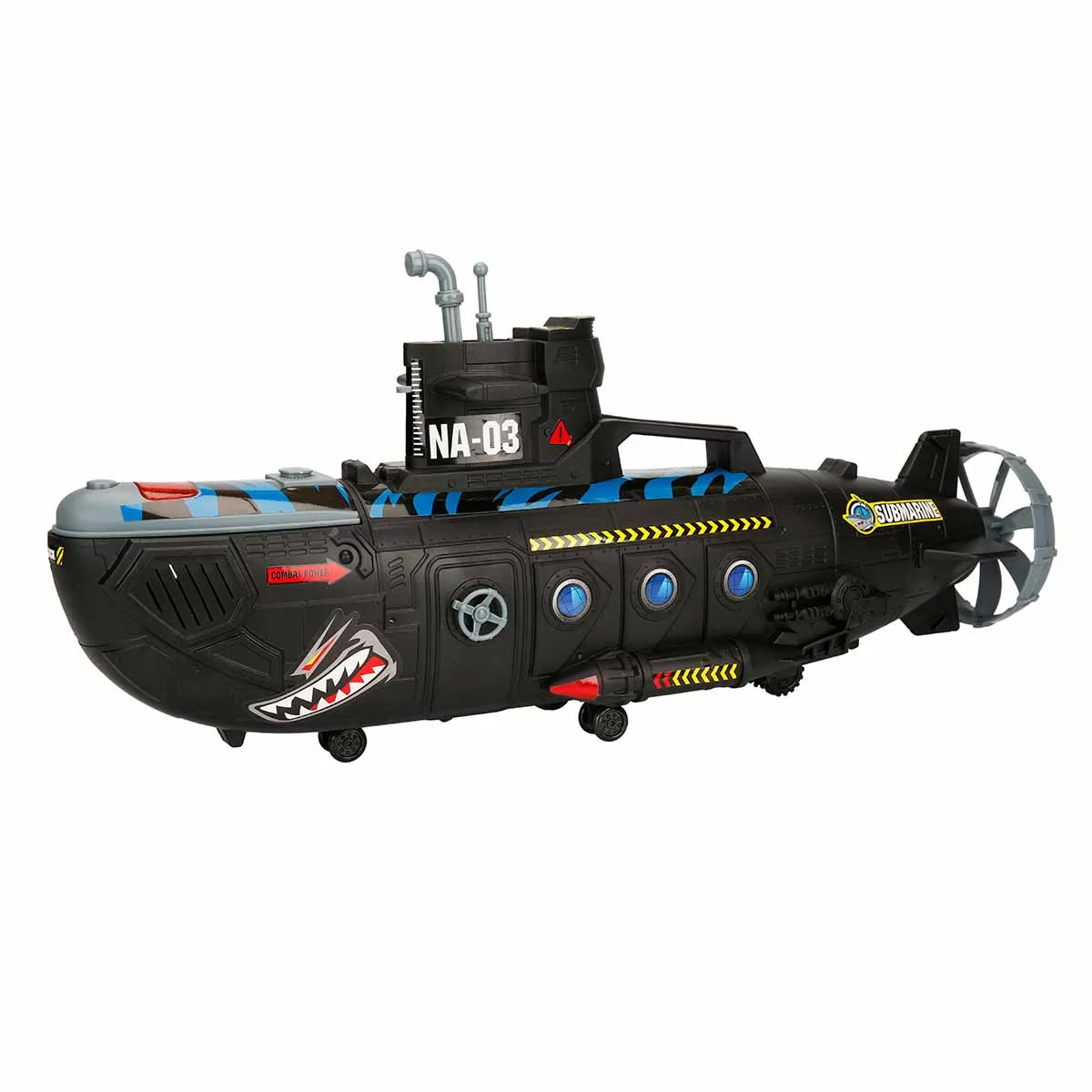 Shark Themed Submarine with Sounds and Lights NA-03 55 cm Dive to unravel the secrets of underwater with the Shark Themed Submarine with Sounds and Lights NA-03! This shark-themed black submarine will develop children's imagination, hand-eye coordination and socialization skills. It works with 2 x 1.5V AG13 / LR44 batteries. Batteries are included in the box. Product dimensions: 55 cm Age Group: 3+ Years Barcode: 8680863027080 Item No :S00002708 Box dimensions:57 x 14.5 x 22.5 cm. Desi Value: 7