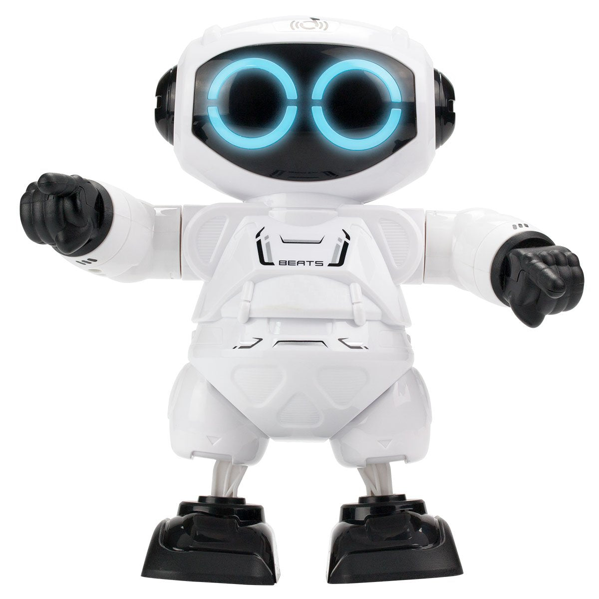 Silverlit Robo Beats 88587 It has a friendly and fun appearance There are two modes - dance and DJ There is a sensor on the head In dance mode, a single press activates the mode; repeated press - pause; double tap - activates the next music track In DJ mode - press once to activate the mode; pressing again activates robotic sounds mixed with onboard music LED eyes Arms and legs have movable joints. Battery life: 45 minutes Dimensions: 19 x 15 x 7 cm Operates with 3 x 1.5V AA / LR6 Batteries. (Batteries not included) Age Group: 3+ Years Barcode: 4891813885870 Item No: SIL/88587 Box Dimensions: 28 x 23 x 13 cm. Desi Value: 3