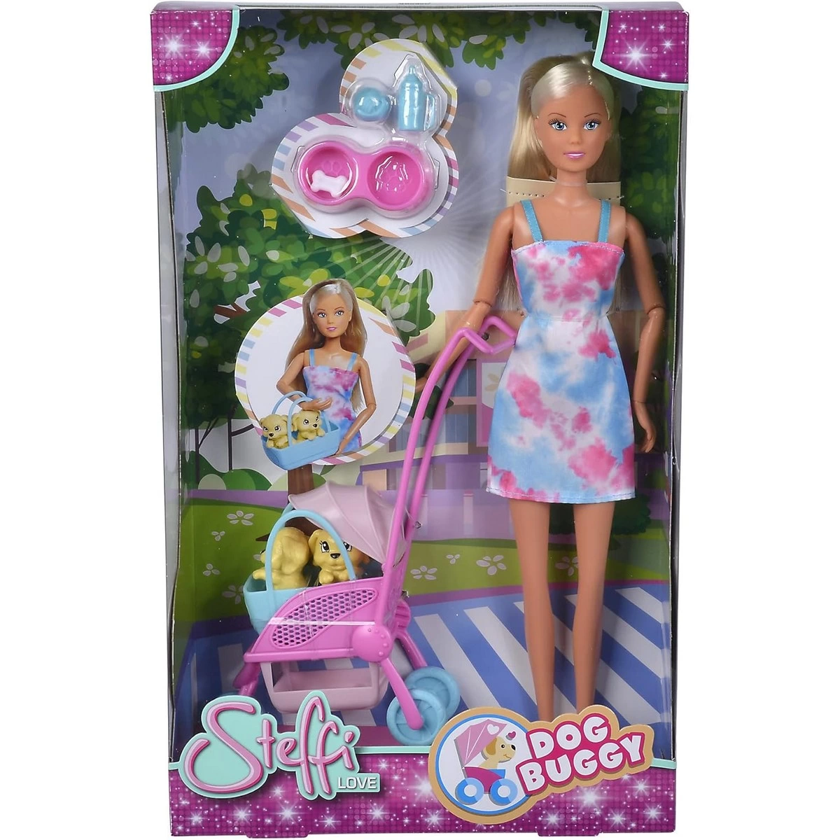 Steffi Love Dog Sitter 29 cm Steffi Love is a true fashion doll. She loves stylish clothes, trendy hairstyles, her little sister Evi and, of course, her friend Kevin. Girls can dress and style their dolls according to the latest fashion trends Steffi loves to go for walks with her two dogs and takes the dog stroller with her so she can give her protégés a break. The stroller has a movable hood and a compartment for storing accessories. The carrying case is removable. Each of the two puppies has room in the carrying case. Steffi can also wear this separately In addition to the doll, the set also includes a car, two dogs and dog accessories. Product dimensions: 29 cm Box dimensions: 7 x 20 x 33 cm. Age group 3+ years