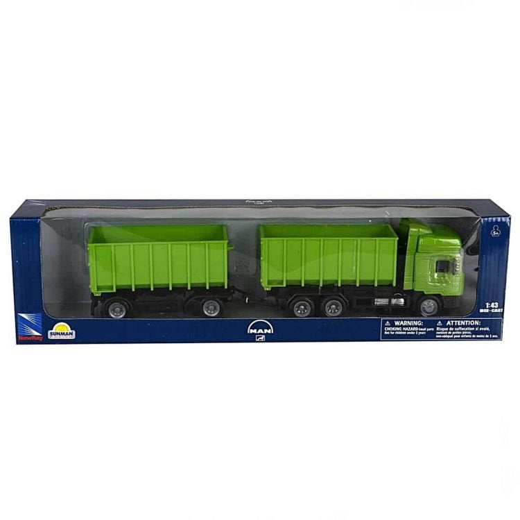 1:43 Man F2000 Double Dump TruckLong Haul Man F2000 Double Dump Truck is with you with its 1:43 scaled down model!Double Dump Truck; Die-cast model, movable wheels, green metal body, quality structure andelaborate design features. Also; You can carry loads in the back of the trucks.Children will be able to play fun games with their friends or alone with these fun-designed long-distance vehicles.Truck Length; 37.5 cm.Age Group: 5+ YearsBarcode: 093577150438Item No: S00015043Box Dimensions: 33 x 20.5 x 6.5 cm.