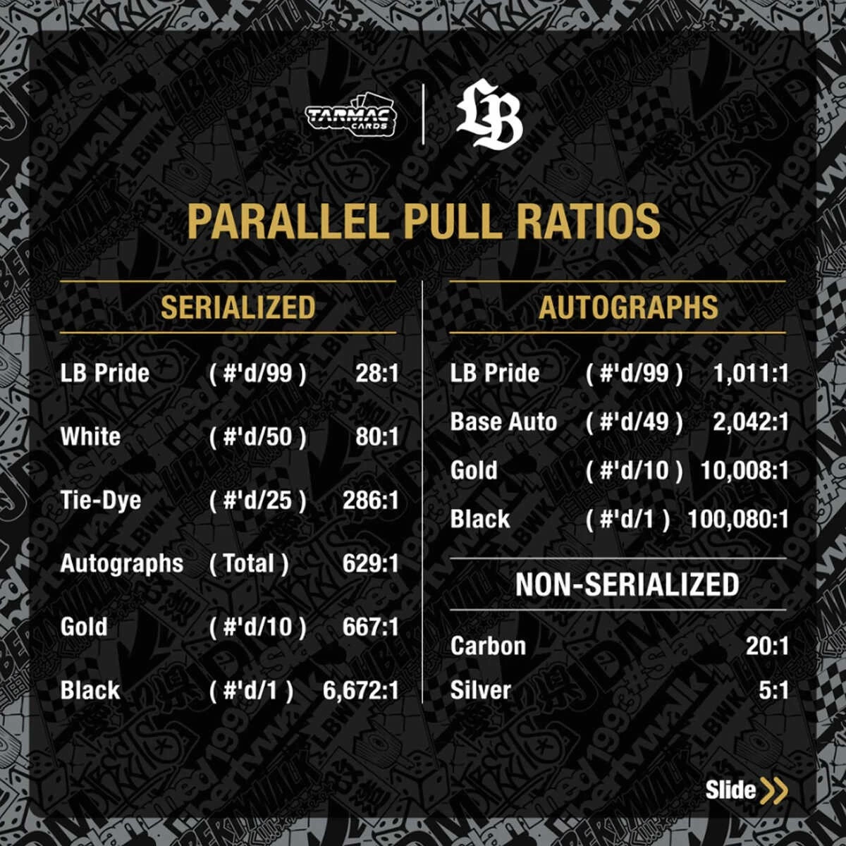 Tarmac Cards Liberty Walk Collectible Cards Volume 01 Box TC-LBC-01 5 Cards per Pack 6 Packs per Box Features: A total of 40 different designs with rare limited edition parallel versions for each card Hunt for Liberty Walk Founder WATARU KATO's super rare autographed cards, of which only 159 are randomly added Average of 1 parallel card per pack 9 Body Kit Versions LB Puzzle on back of card Each box will contain 6 packs (5 cards per pack) and will be limited to 3,333 boxes worldwide Officially licensed by Liberty Walk Limited Edition Parallels Includes: Serial Numbers: a/ BLACK ( #d/1 ) b/ GOLD ( #d/10 ) c/ TIE-DYE ( #d/25 ) d/ BASE AUTO ( #d/49 ) e/ WHITE ( #d/50 ) f/ LB PRIDE ( #d/99 ) Without Serial Numbers: g/ CARBON h/ SILVER Age Group 14+ Years