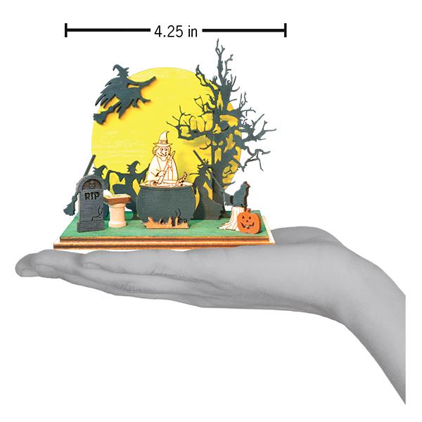 Light the Witches Convention at your own risk! With a small hole on its underside designed to borrow a standard bulb from your Christmas tree your cottage will light up. Upon lighting your cottage, you will immediately discover the first of many secrets, the spook-tacularly crafted scene inside. Looks like the witches brought a long friend or two; can you find the ghost and two cats? How many witches can you find in attendance at this convention?