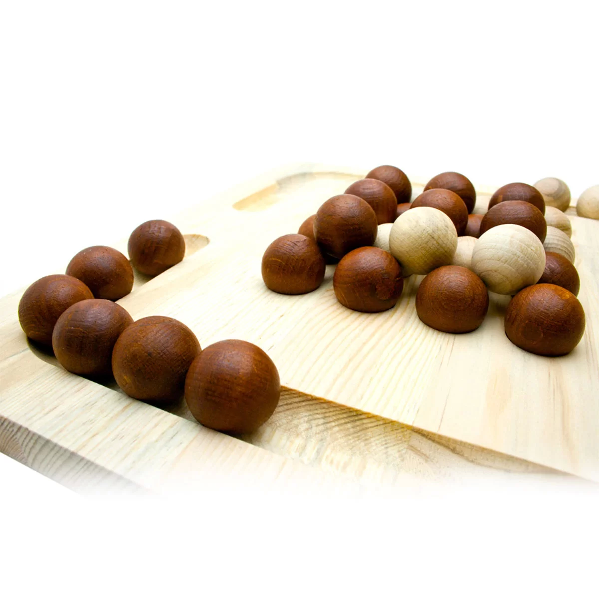 Wood Hill Wooden Pyramid Mind Intelligence Game A game to develop intelligence, attention and strategy. Two Players Play with Balls of Different Colors. The Last Piece to Put on the Hill Wins the Game. The game has 3 basic rules. 1- The player who brings 4 pieces horizontally and vertically together can withdraw 2 of their pieces from the game. 2- The player who creates a square of the same color next to each other can withdraw 2 of their pieces from the game. 3- You cannot move a piece until you create a square on the game board. When a square is formed, you can only move it on the square. Made of 100% Wooden Material. Player Age 5+ Number of Players 2 Box Contents 29 x 29 cm natural wooden game table. 30 pieces of 25 mm diameter natural wooden balls. Weight 1375 g Dimensions 30 x 33.5 x 8 cm. Age Group: 5+ Years Barcode: 8697418023084 Item No: ANT-02308 Box Dimensions: 35 x 31.5 x 9 cm. Desi Value: 4